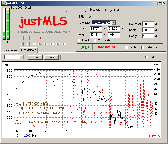 Вот измерения в точке прослушивания (примерно 2.5метра, на диване вдоль задней стены)