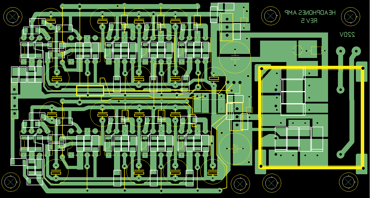 Разведена под конденсторы 8мм по ногам ОУ, диоды в БП - со стороны монтажа.