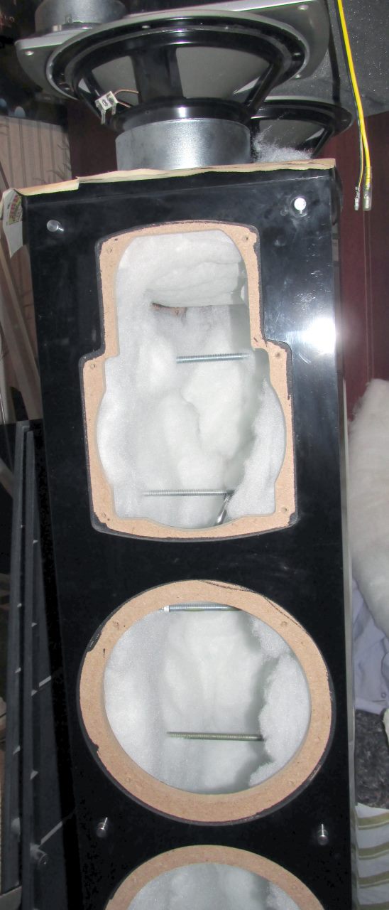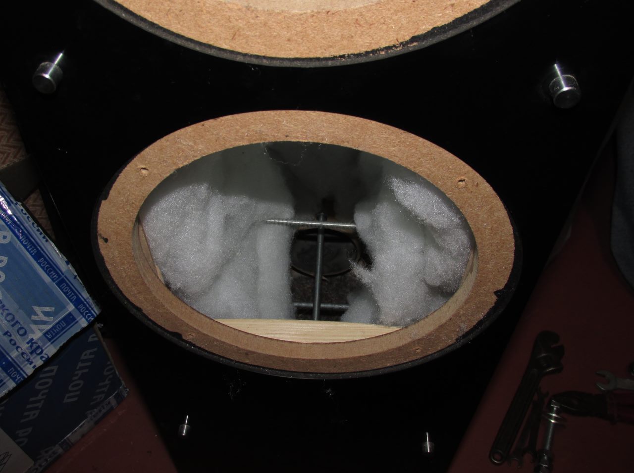 Сверху и снизу от НЧ динамиков расположены подушки толстого поролона. Провода закреплены к стенкам скобами, с прокладкой из мягких тряпочек сделаных неясно из чего, мягкие, волокнистые из разноцветного всякого. Такаяже тряпочка покрывает всю нижнюю панель, сверху ватиновая распушенная подушка.