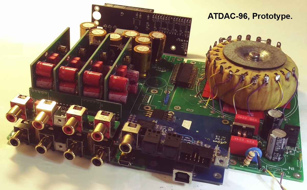 Пришло время и для нового многоканальника, названного ATDAC-96. Он результат нескольких компромиссов, а также некоторых изменений «в последний момент», когда прототип уже был готов «в железе». В нем использованы уже имевшиеся модули М1293, отдельным модулем сделан аналоговый регулятор громкости, совмещенный с мьютовыми реле («выходной модуль».