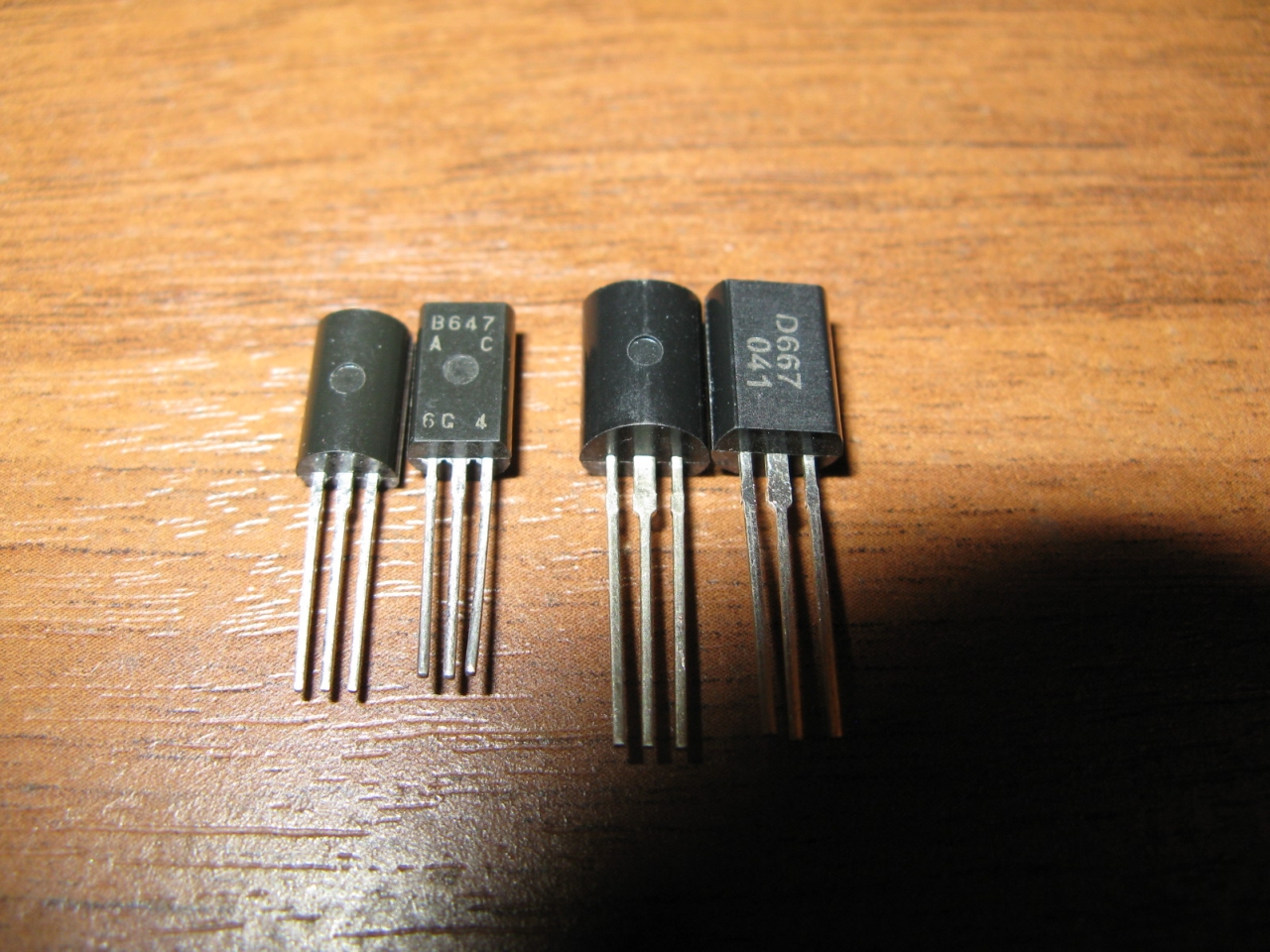 647A - транзистор с более высоким допустимым напряжением Vceo -100V. Те, что без суффиксов, как 667й - Vceo 80V. Может этим и обусловлена разница во внешнем виде, те, что без "A" могут быть старой версией, не знаю. В пары надо либо 647A/667A или 647/667. У меня есть пары 647/667, но пока не придумал куда их применить из-за малого запаса по напряжению.