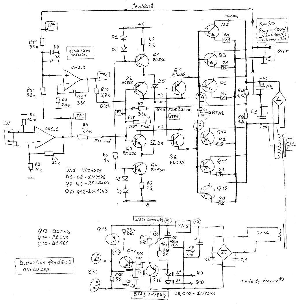 Можно пару вопросов: где в схеме прямая связь (сигнал искажений, подающийся на выход)? и как достигается ограничение тока выходников?