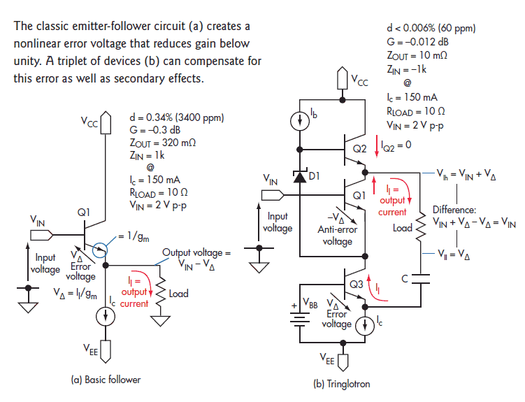 Здесь та же концептуальная идея - транзистор Q1 воздействует на Q3 так , чтобы ток Q2 был всегда постоянным , независимо от тока нагрузки . То есть , вся схема работает как источник тока для Q2 . Это должно полностью убирать "токовую" составляющую искажений Q2 , так что останется только эффект Эрли .... но что интересно - эта схема будет продолжать работать , даже выйдя из класса А - она тогда перейдёт в АВ , и будет работать как обычный комплементарный повторитель , хотя искажения , разумеется , возрастут . Ещё один момент - цепочка R1-C1 служит для коррекции петли ОС по току Q2 , устраняя риск самовозбуждения , и одновременно она же пропускает сигнал на базу Q3 в обход , чтобы уменьшить эффект запаздывания - это должно улучшить работу каскада на ВЧ .