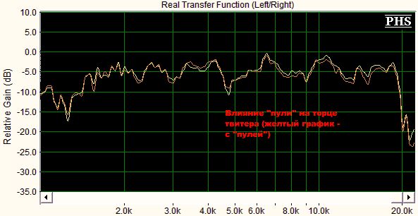 Допплер уменьшится, так как твитер неподвижен и отражатель тоже неподвижен. Я померил микрофоном два варианта - нетронутый 4ГД35 и доработанный с твитером (последний вариант). В измерениях трудно отделить ИМ-искажения динамика/усилителя/микрофона от допплеровских искажений, но улучшение в сабже видно. Уровень напряжения сигнала на динамиках не менялся.