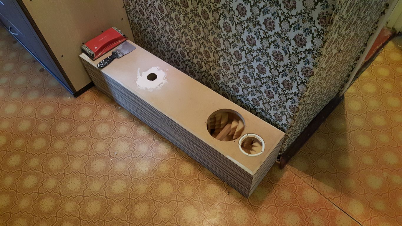 Сделал корпус из 24мм МДФ 1030х230х260мм (Высота х Ширина х Глубина) три распорки между боковыми и одна между передней и задней стенкой.
