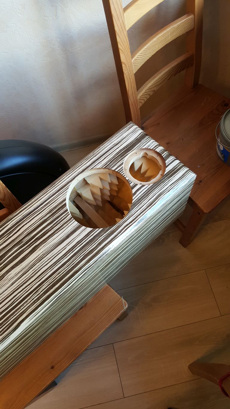 Обклеил шпоном зебрано файнлайн по утюжной технологии, покрыл 5 слоями водного паркетного лака.