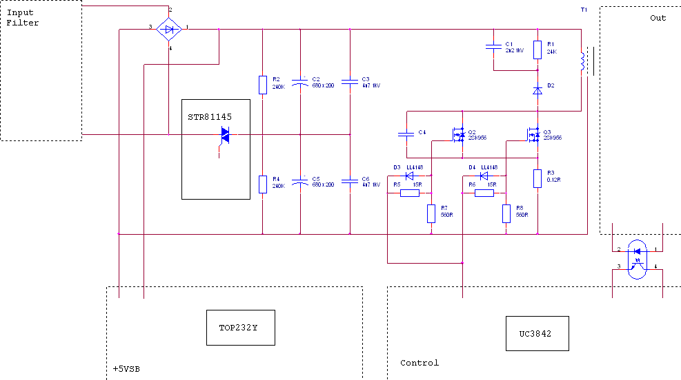 Схему найти не удалось, поэтому срисовывал интересующую часть с платы, нумерация является чисто условной и оригиналу не соответствует.