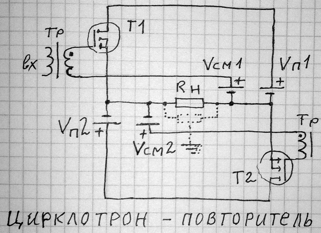 Если полуобмотки включить последовательно, а среднюю точку соединить со средней точкой нагрузки (с землёй), (схема классического цирклотрона) то выходное сопротивление увеличится вдвое, а коэффициент усиления (по каждой полуобмотке) примерно удвоится. (за счёт снижения вдвое ООС).