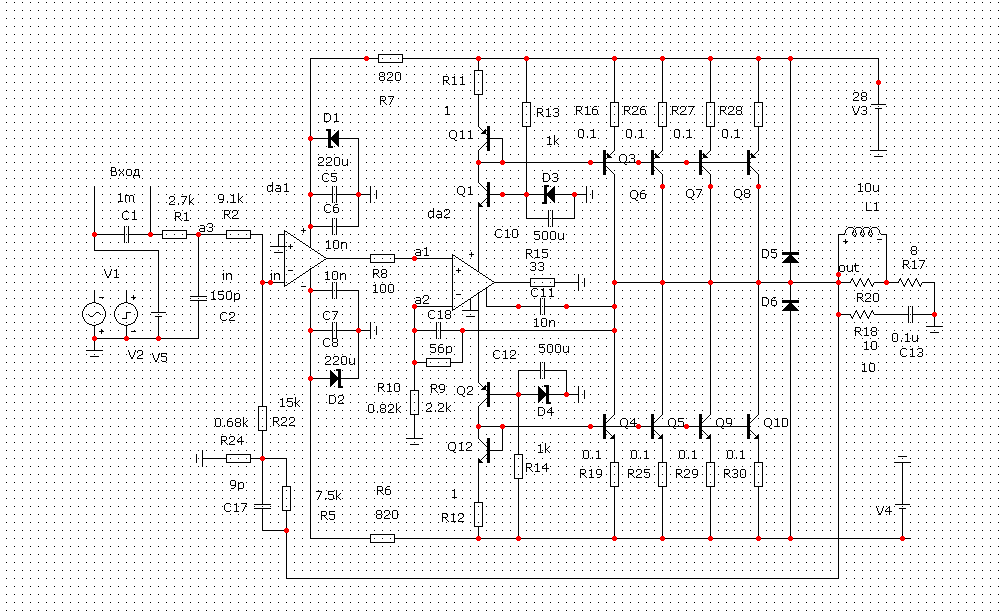 Собственно собирал на это МС LT1210 ранее на ней несколько проектов, пару усилителей для наушников и усилитель "Динамит". Захотелось воплотить в железе композит , но поскольку в разработке схем и ПП не силен, то обращаюсь за помощью. В итоге есть на данный момент вот такая "черновая" схема , прежде чем реализовывать ее в ПП, хотелось бы вынести эту схему на обсуждение с целью ее возможной оптимизации. Планируется работа на нагрузку 8 Ом. Выходники Тошиба 1930/5171