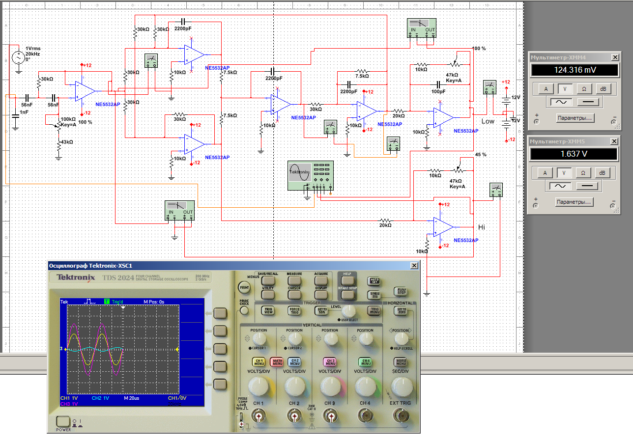 Строю активный кроссовер двух полосный, в принципе все понятно, но есть один нюанс: на выходе НЧ канала всего 120 mV, для сравнения на выходе СЧ/ВЧ канала больше 1,5 вольта!