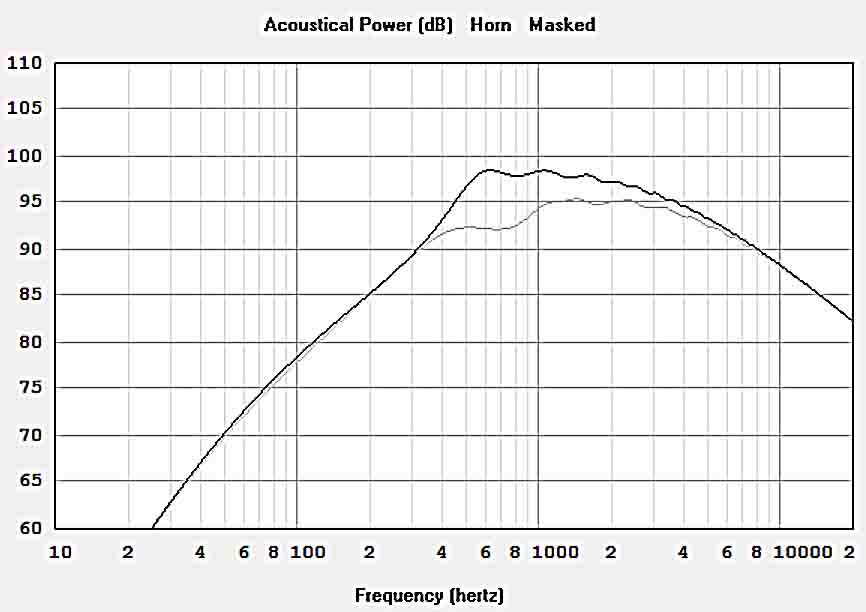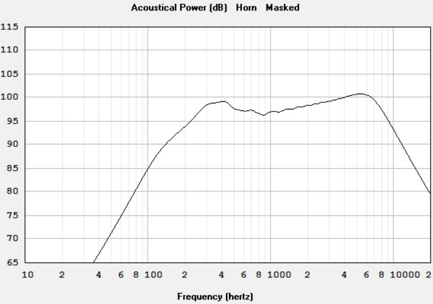__ Прежде чем собирать железо, попробовал промоделировать ГГ в программе Hornesp. Результаты моделирования как бы воодушевляют. В желаемом диапазоне Hornresp выдаёт чувствительность около 100дБ (1Вт, 1м), при амплитуде смещения "диффузора" на 500Гц - 0,040мм.