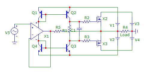 Так и тут - с ОИ. Выход УНа включен между истоками и затворами, нагрузка - между истоками и стоками. И конденсатор на месте Но с ним последовательно не включен источник питания с помехами