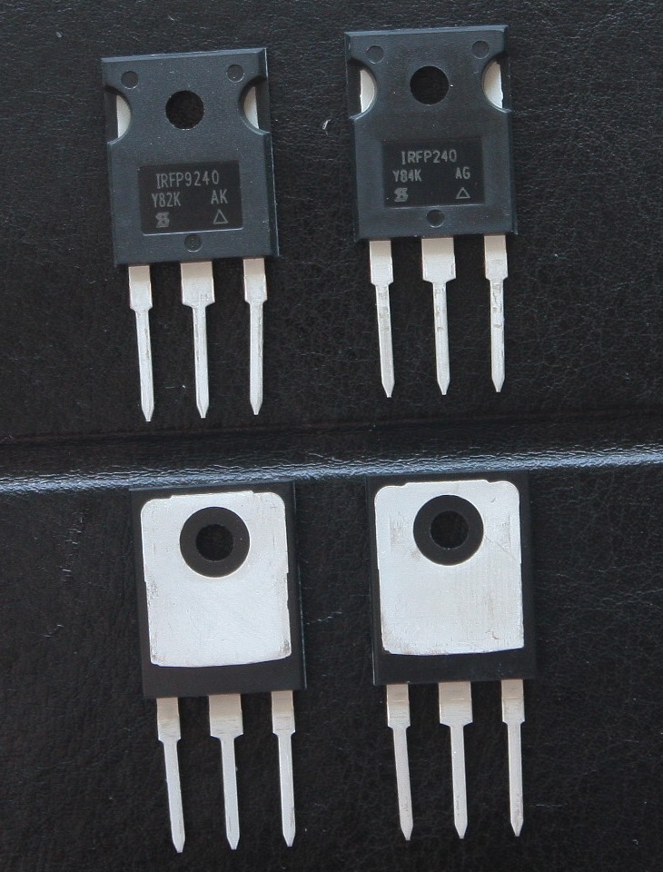 Джентльмены, а посмотрите на фото. Слева IRFP9240 вроде сомнений не вызывают. А вот правые 240 - текст на корпусе явно другой, как-то небрежно выполнено. В нижнем круге на 9240 видна, судя по всему, неделя выпуска (читается W34), на 240 её нет. Собственно, начал рассматривать после попыток подбора пар для YES-3 быстрым методом (затвор и сток соединены, сток-питание через нагрузку 120 Ом, падение напряжения на исток-сток стабильно превышает 4 вольта. Для 9240 оно хорошо укладывается в зону 3,64..3,65 В для 8 штук - судя по форуму, так оно и есть).