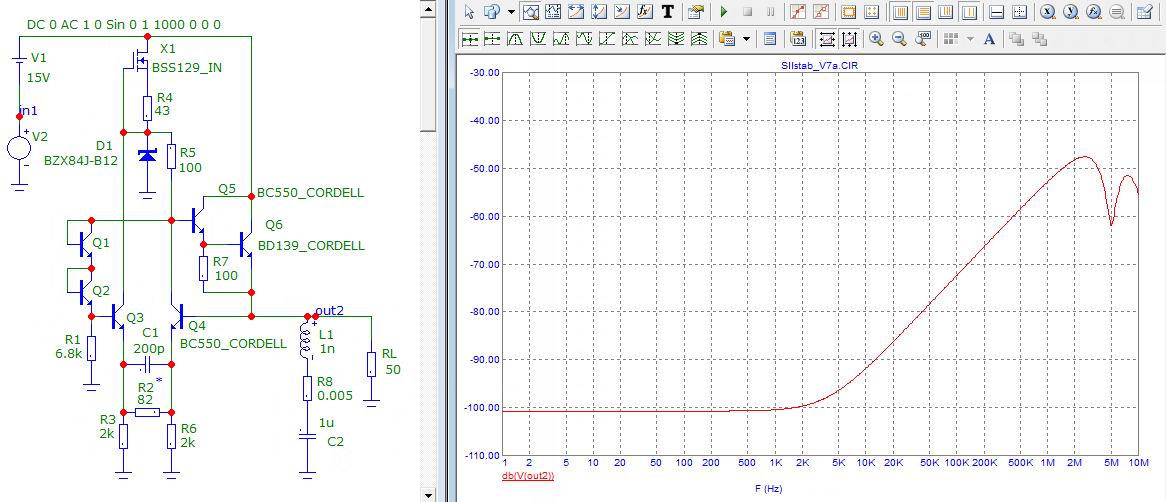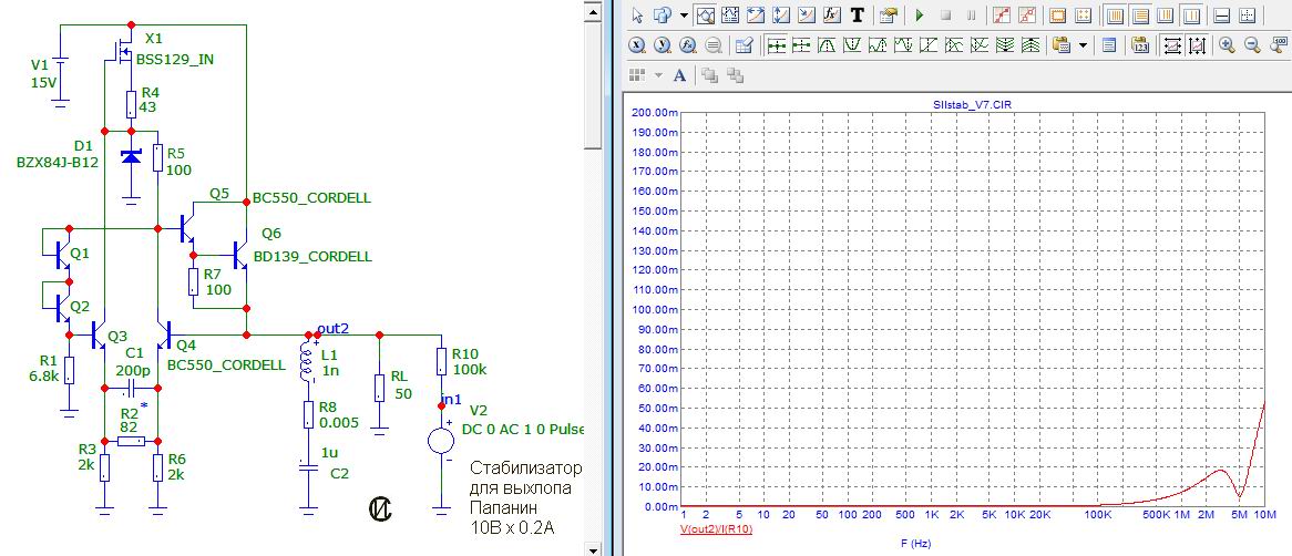 На основе идеи собрал стабилизатор для выхлопа Папанин. Схема половинки и результаты моделирования на рисунках. На вч пока проверить нечем, (сделаю позже), а на постоянке характеристики близкие.