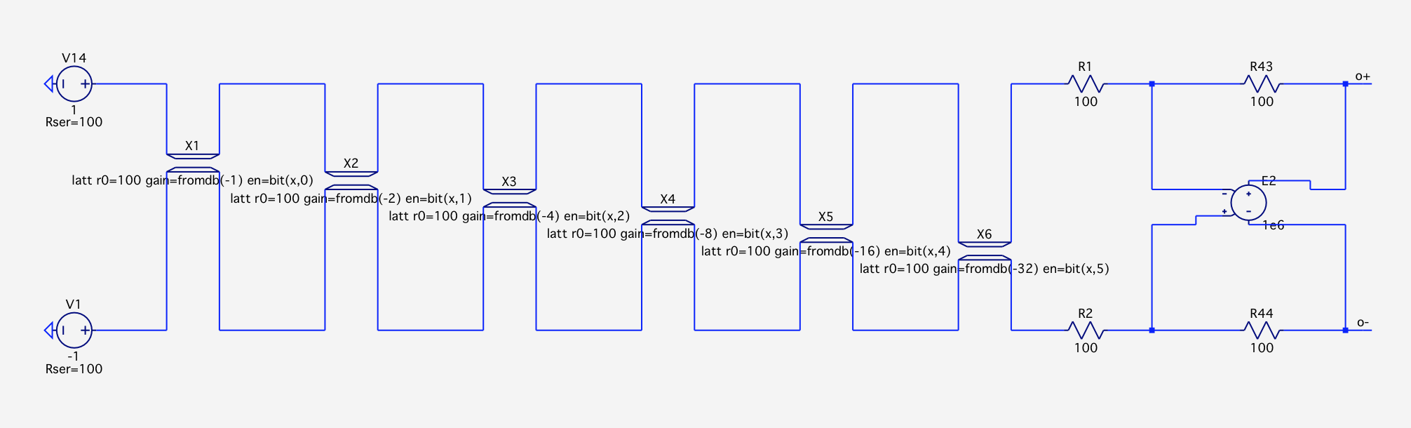 Т.к. формулу выводил я, да ещё и на бумажке, то она подогнана не под половину, а под полное На картинке симуляция с Z0=100 ом, чтобы проще было резисторы масштабировать под нужное. Хотя если сделать мощный цап, то можно и 50 ом, с 50-омными реле, чтобы полоса до ггц была