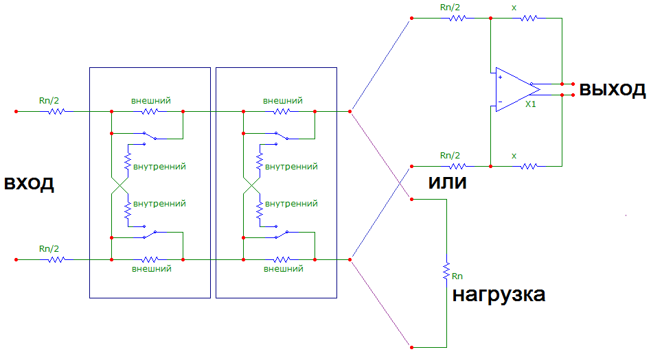 Однако, как я понял, совсем до недавнего времени очень многие на веге считали, что постоянный вх/вых импеданс неосуществим с числом "сигнальных контактов" (по которым течёт ток сигнала) равным никитинскому (один на звено). И для меня было полной неожиданностью, что на ветке про никитинский после моего упоминания о таких схемах люди начали "просить показать". Ну вот и показываем по-тихоньку, а никитинский монополизма лишился на это "преимущество", причём сразу тремя схемами П,Т и T-бридж . Более того, для О-балансной и этой схемы (клеточная) число реле с двумя группами на перекидку (самая распространённая комбинация у маломощных реле) ровно такое же как у балансного никитинского.