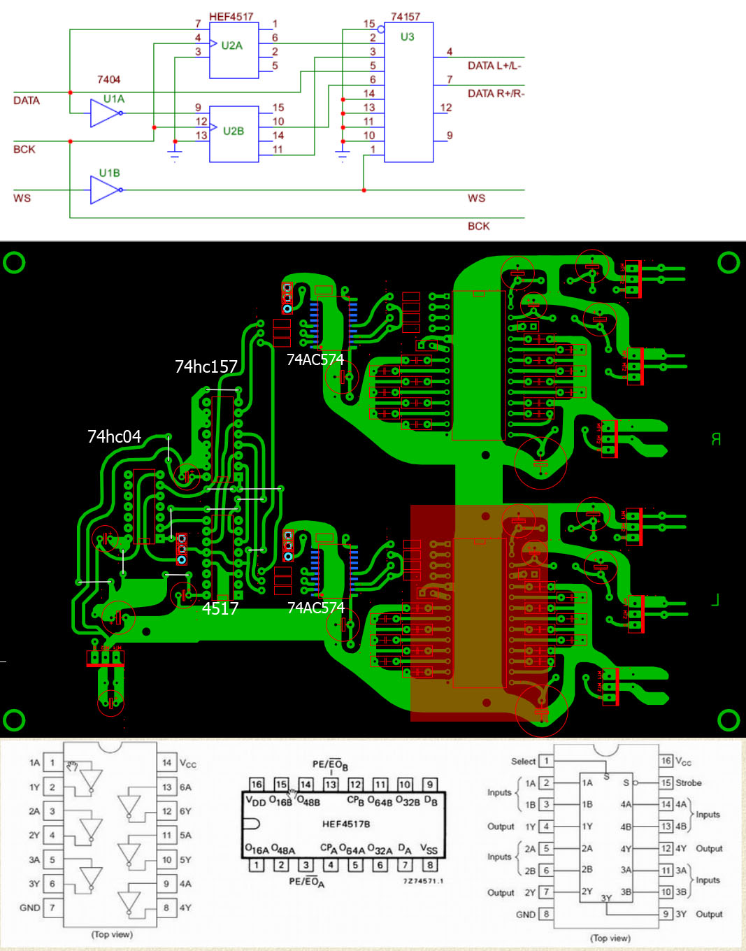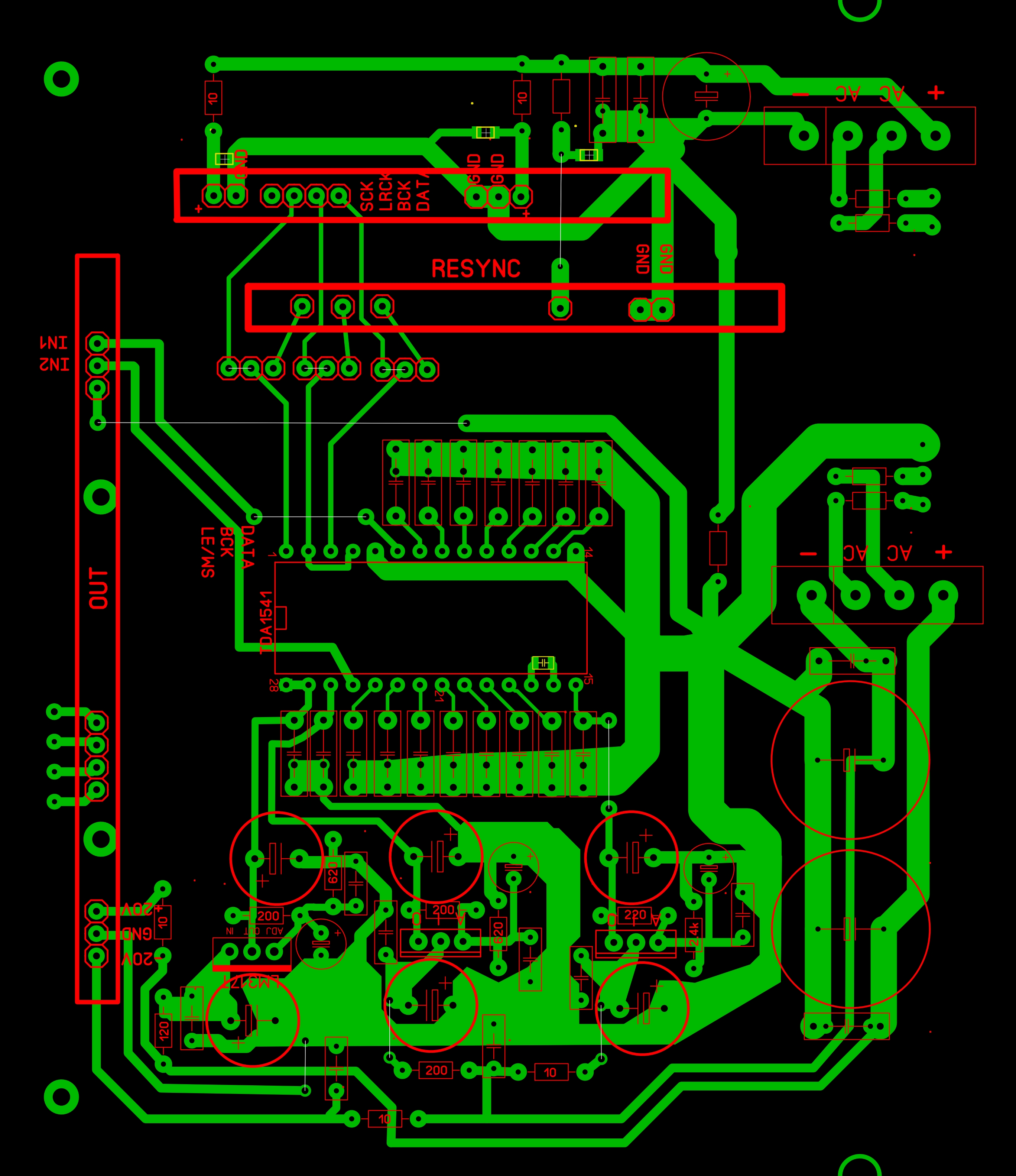 Просьба помочь выявить косяк - сделал печатную плату, звук есть только в одном канале(пробовал балансом в аимпе - один кана работает верно), во втором же канале тишина, пометил на пп красным, помогите пожалуйста разобраться в чем тут дело.