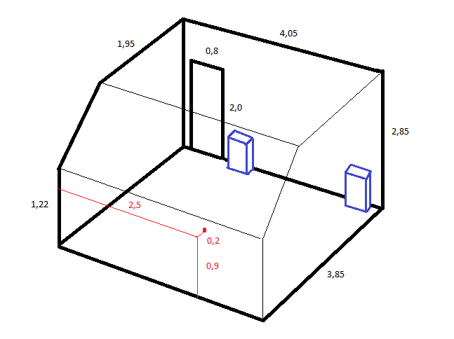 Вот эскиз спальни, где красная точка - положение головы, синие - АС. Дверной проем всегда открыт. Комната на мансарде, так что часть потолка - наклонная, а часть - горизонтальная.