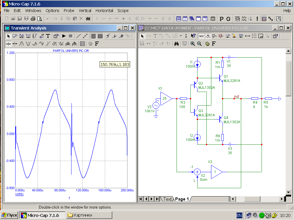 Просимулировал .На нагрузке амплитуда 25в,Rн=4ом.Искажения на нагрузке не привожу,потому,что они отсутствуют .Сумматор и усилители идеальные,понятно,что таких не бывает.В железе основная проблема будет в сумматоре.Радует факт,что полностью подавляются искажения повторителя и в железе они будут определяться качеством сумматора .Слева график напряжения коррекции.