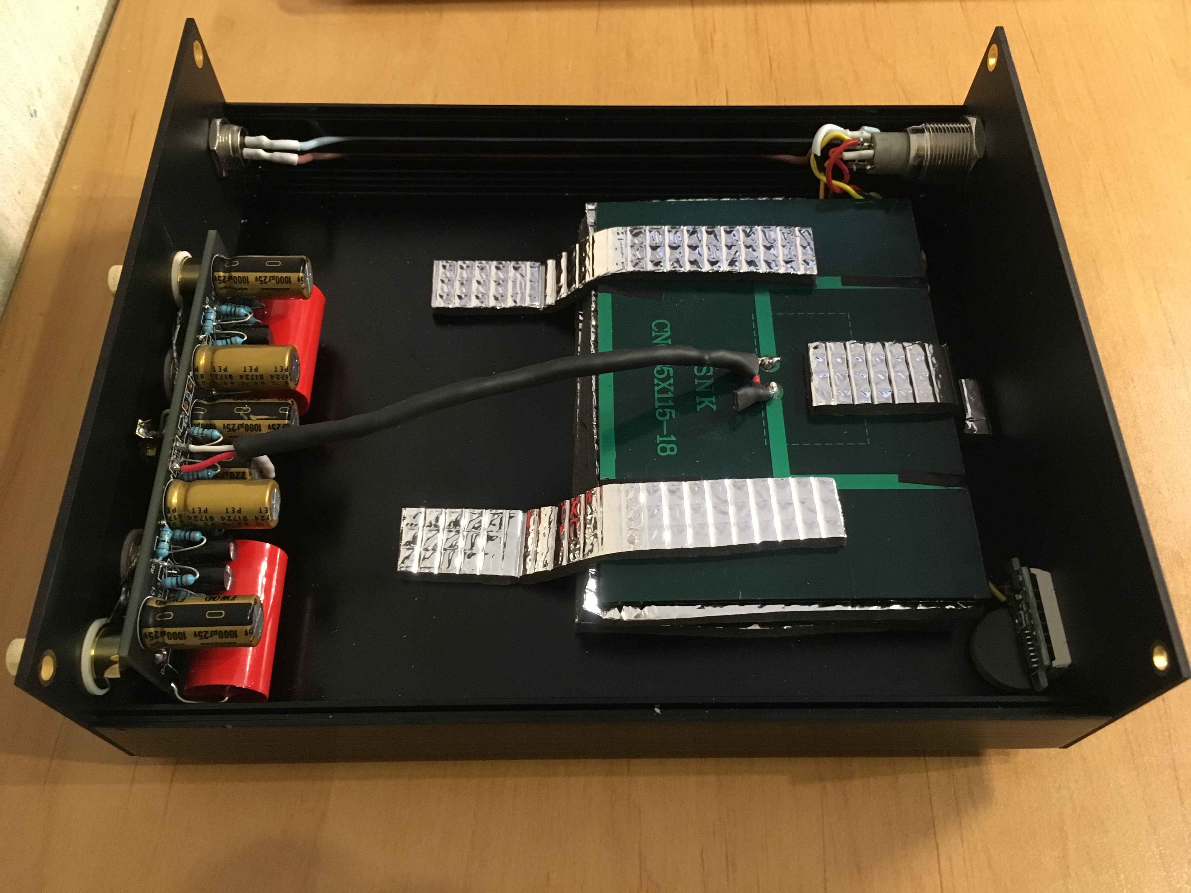 Для питания светодиодов использован нестабилизированный трансформаторный БП - под нагрузкой 11,5 - 11,9 В, без нагрузки - 17.5 В. Импульсный БП использовать нельзя, появляется фон, причем хороший такой. Хочу попробовать стабилизированное питание на LM-ке (с трансформатором в БП).