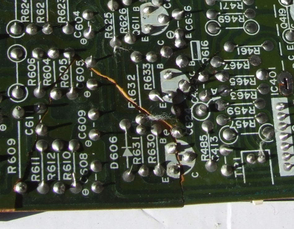 прогресс идет . Главный инструмент - НОС . В общем , лью . отмываю , спирт меняю . Стало лучше , но в процессе определены также точечные источники - транзисторы под замену , плата по немноу выветривается определилась тендеция что от мытья с выветриванием становится лучше . Чтобы не создавать новую тему - как поремонтировать пролом платы 3D three dimentional /форма треугольника перелом со смещением . Т.е . чтобы понимать , от края платы большей стороной к краю платы , острой во внутрь . Последствия - пока вся плата гуляет в таком состоянии . Пока что сделано - выпаяны детали в зоне треугольника чтобы понимать куда трещины можно шатать . Сразу скажу - по-простому не получится на суперклей , палки и связующее вещество . Пока есть мысль - поверху бляху из стеклоткстолита по размеру треуольника на текстолит с просверливанием отверстий под выводы элементов .