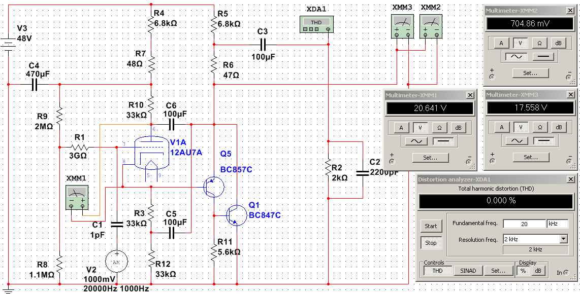 Схема, сама по себе, достаточно линейна даже при значительном снижении напряжения питания и превосходно линейна от 40V вплоть до 60V.