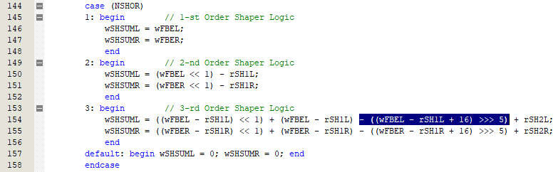 С момента публикации прошлой версии ЦФ прокачал скилл по верилогу, поэтому новый ЦФ выполнен проще, и с более сложной арифметикой. В частности добавлены опции шейпера и дополнительного апсемплера, что позволяет выводить данные в том числе на малоразрядные ЦАП, типа AK4499EX.