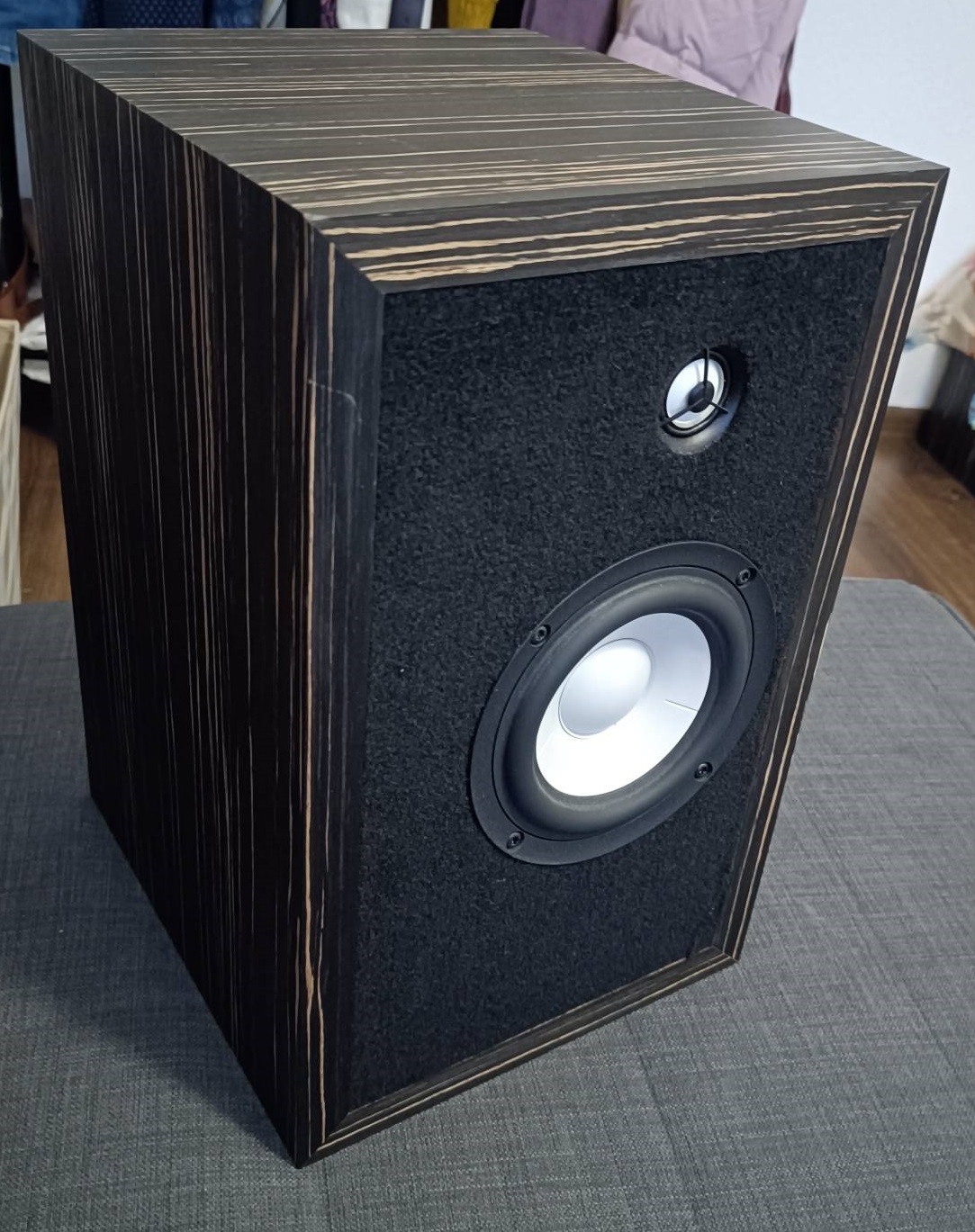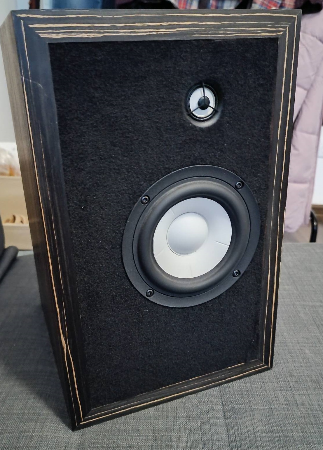 3) АС на заказных 5-дюймовых мидбасах AUDAX с аэрогелевыми диффузорами, в качестве пищалок SRT-7 от Д.Малиновского. Оформление – ФИ, в следующей модели Дмитрием применено оформление типа ПИ(пассивный излучатель), что позволило уменьшить нижнюю граничную частоту, для таких небольших размеров излучателей никаких проблем с качеством баса при переходе на ПИ не возникло.