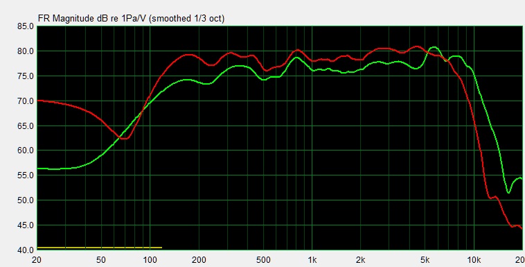 МП1344-1-8 ом - зелёная. Для сравнения Vifa P13MG-10-04 - красная. Передняя панель 310х500. 40 см до микрофона.