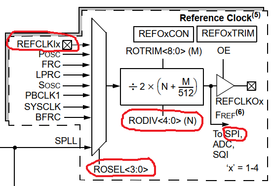 и в это не сразу въехал. Почему то казалось, что на картинке из поста 314, иксы для входа и выхода могут быть разные. Теперь понял что в чипе 4 набора мультиплексоров и делителей, по кол-ву SPI модулей и к REFCLKO1 может быть подключен только первый тактовый вход.