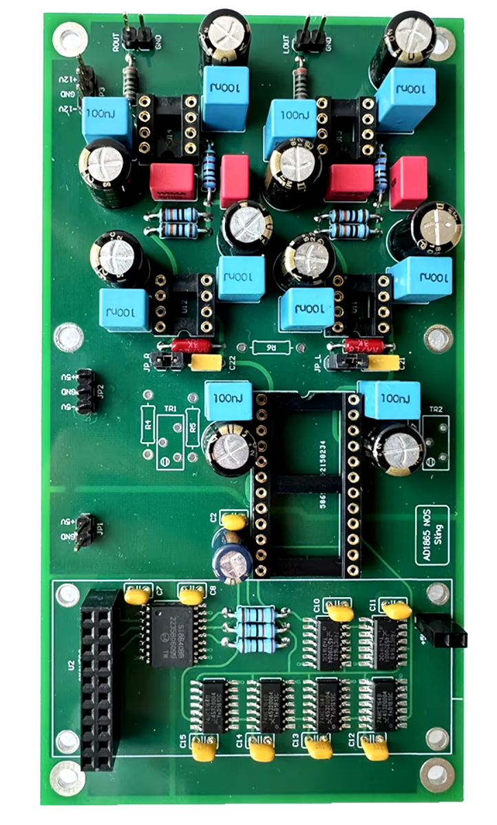 Валялась у меня старенькая кривоногая 1865 и ворох разных опашек, от вшивеньких 5532 до каких-то немецких чудо-юд класса А, собранных на дискретной смд рассыпухе (полевики, танталы, эзотерика)... Решил я дать этой цапе жизнь, и с наскока купил у китайцев плату с уже распаянными компонентами и сокетами под установку цапа и усилителей, для питания временно (нет ничего более постоянного, чем рабочее временное решение) использую модули mornsun UWF1212-3WR3 и 1205, тк обычные фильтрованные 12В у меня всегда под рукой. По первой операционник и I/U будут питаться 12 Вольтами, потому что у меня есть нужные конвертеры, но в последующем планирую поднять до 15В. В качестве транспорта с юсб на квадратную шину планируется тюнячий клон платы аманеро от тех же китайцев, с хорошими клоками (чтобы не путать их с клоаками). Вот схема этого гов... народного сяоцзиньского творчества: