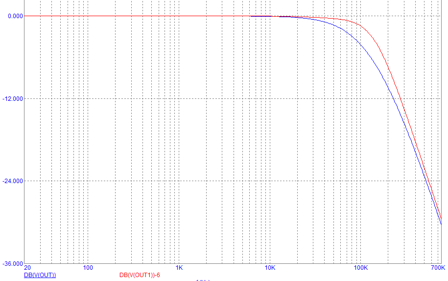 Даташит валит от 100кГц - 3 октавы около 36дБ - совпадает. В твоей схеме говоришь 56дБ? 56-36=20дБ - значит ты режешь почти на 2 октавы ниже, эдак с 30 кГц.