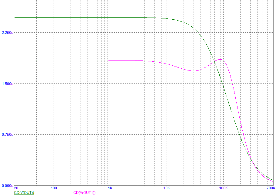 У меня по симуляции получается у схемы №3 усиление 0 и спад на 768 кГц -56дБ, а в даташитной схеме: усиление +15 дБ и спад на 768 кГц -35 дБ.