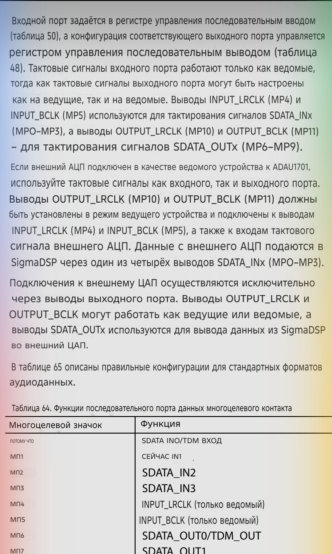 Мне нужно подключить к ADAU1701 2 источника по I2S. Один из них это DIR9001, второй - модуль блютуз (какой именно пока ещё не определился, но надо чтобы был с кодеком AAC либо APTx HD). Встроенные АЦП 1701 тоже предполагается использовать.