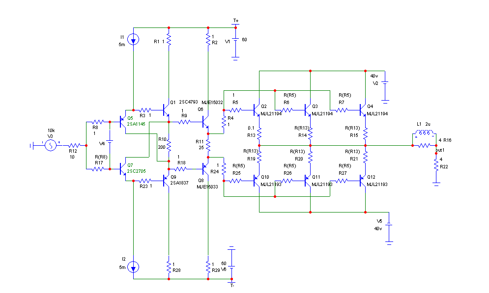 Самый неизведанный момент для меня - то, как соединены левая и правая половины входного каскада. Я такого не видел, так что это чистая отсебятина. Остальное во многом позаимствовано отсюда:
