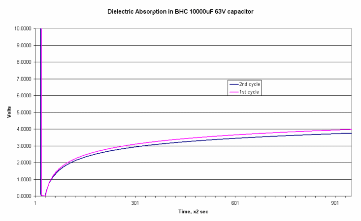 Кстати, сейчас делаю измерения "утечки" всё того же BHC 10000uF после 5 часов разряда на 8 Ом. На первый взгляд кривая будет очень близка к снятой вчера при заряде конденсатора, пролежавшего 13 лет после изготовления... . Через пару часиков увидим.