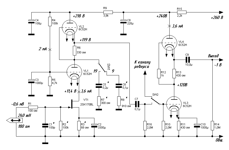 К посту 776. В первом каскаде верхний триод можно безболезненно выкинуть, заменив его резистором 33-39 кОм (в этом случае даже цепи коррекции менять не надо), и подключив разделительный конденсатор к аноду нижнего триода. При замене нувисторов на 6Н16Б или 6Н33Б (с перерасчетом режимов) весь УВ, с учетом каналов реверса, можно собрать всего на 4 баллонах (правда, несколько упадет усиление).