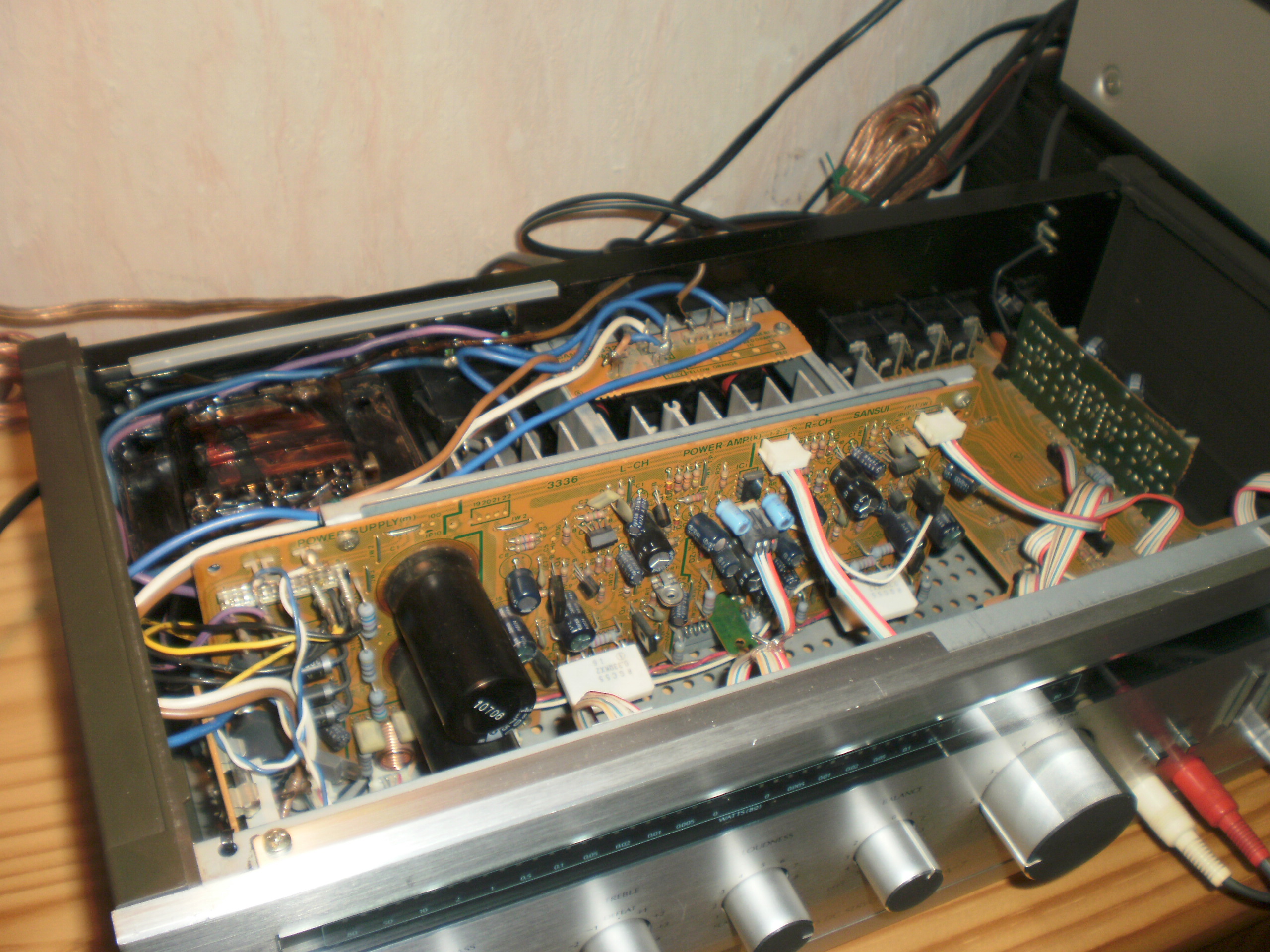 Сделано все также капитально, как и в преде, ко всему можно добраться, только радиаторы, заднюю панель и платы уже приходилось откручивать. Чтобы поменять все мелкие электролиты пришлось потратить не меньше пары часов. На замену использовал оригинальные электролиты Samwha и Jamicon стандартных серий на 63 В и на 100 В. Большие банки – 4 шт. по 15000 мкФ (К50-37) – вполне живые и я их оставил на своих местах.