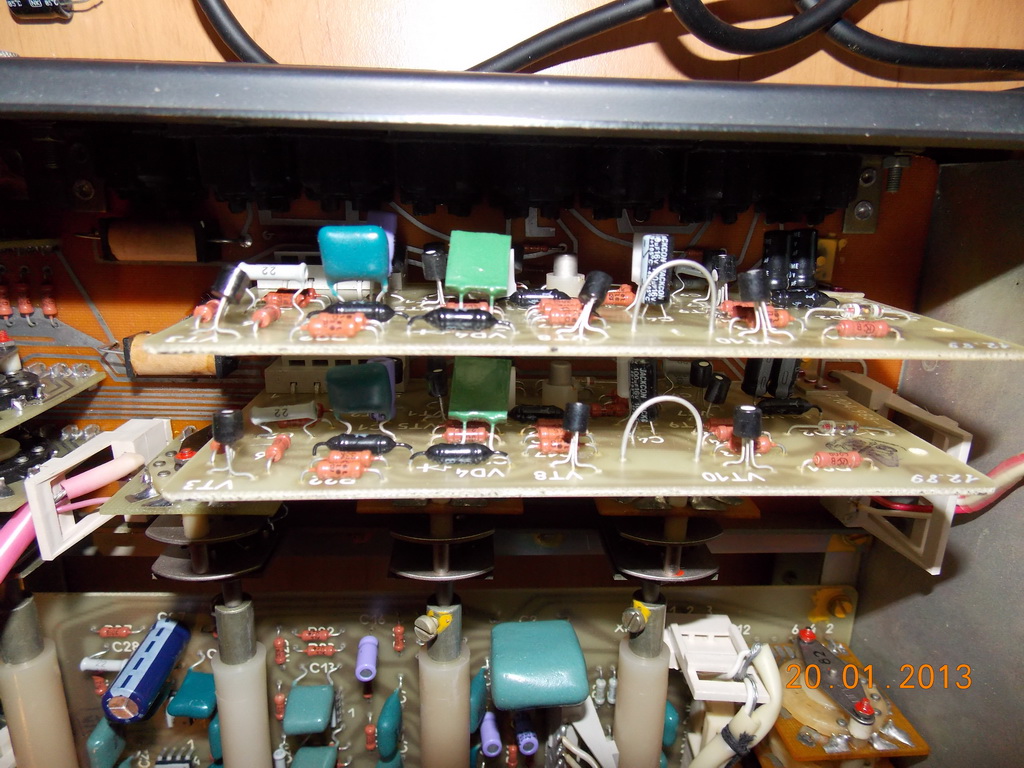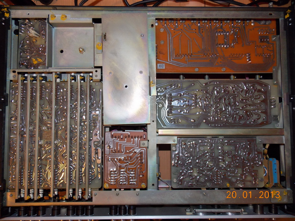 Конструкция преда продумана и вызывает уважение к разработчикам. Корпус прочный и жесткий. При снятии верхней и нижней крышки все платы остаются на шасси, а доступ обеспечивается ко всем узлам. Все коммутационные входные цепи и платы ММ RIAA корректора находятся непосредственно у входа, сигнал приходит на РГ уже после каскадов усиления, поэтому не так страшно, что РГ на передней панели. Все регуляторы дискретные и в отличном состоянии на сегодняшний день. Основная коммутация выполнена на качественных галетниках, которые и ныне пребывают в полном порядке. Кнопочные переключатели тоже все в рабочем состоянии. Все почистил и смазал, но это так, на всякий случай.