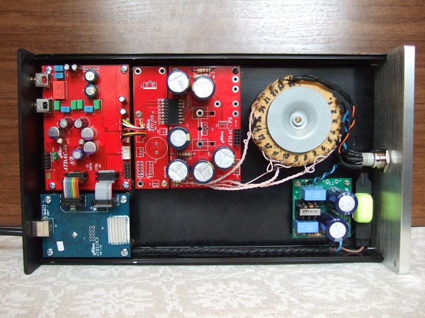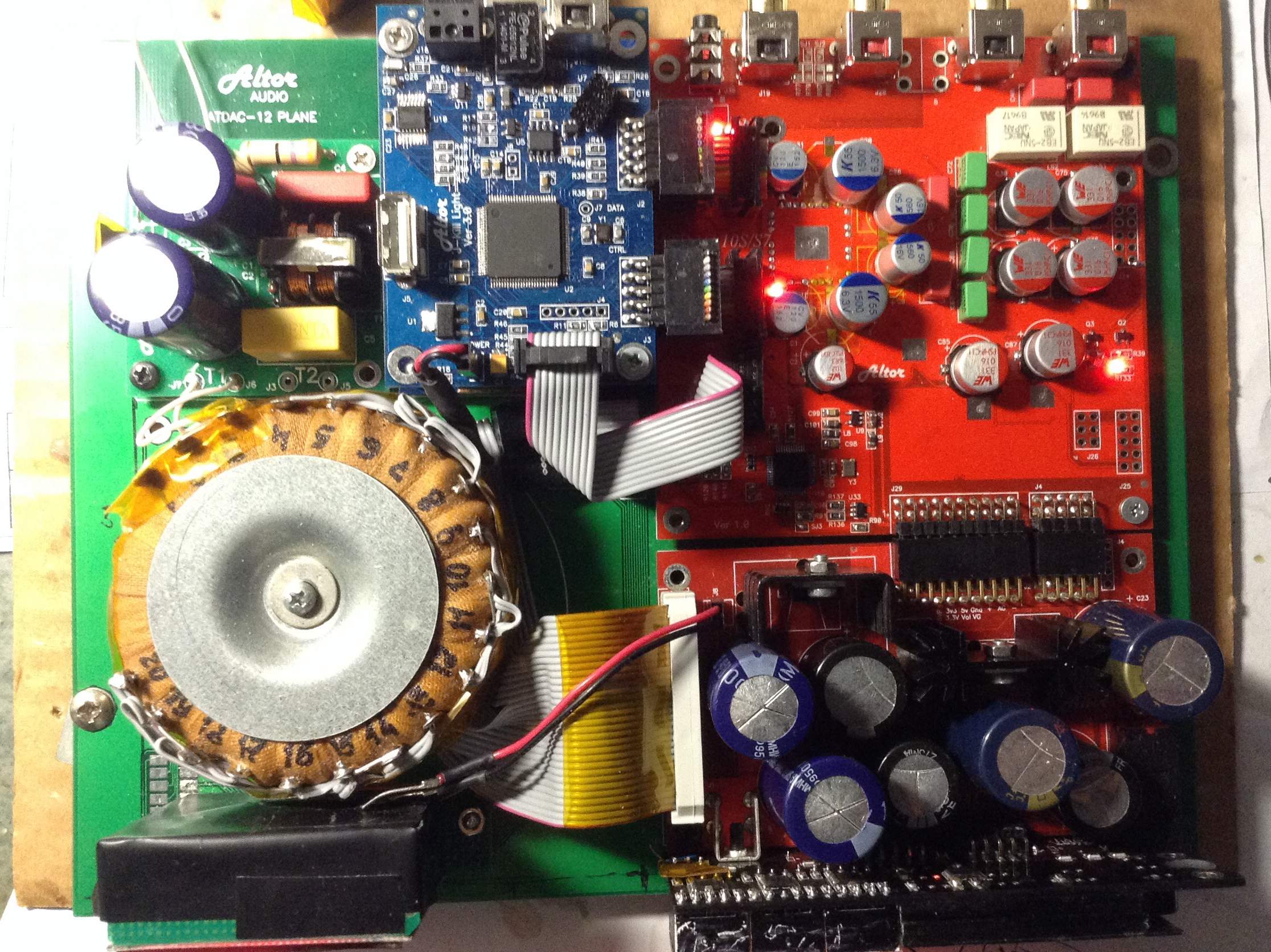 Две синих платы (одна над другой) - платы входных интерфейсов. xVeloci - для USB, JKill Lite (сверху) - для оптики и спдиф.
