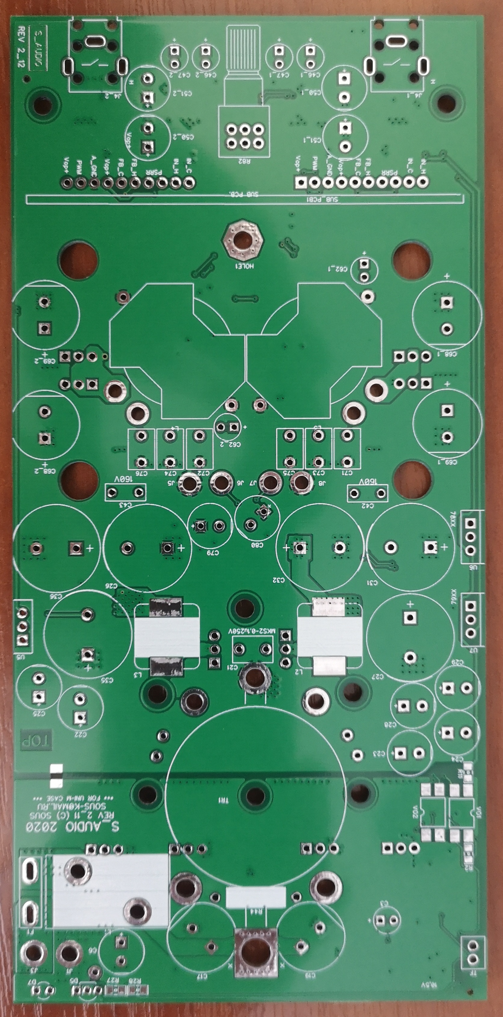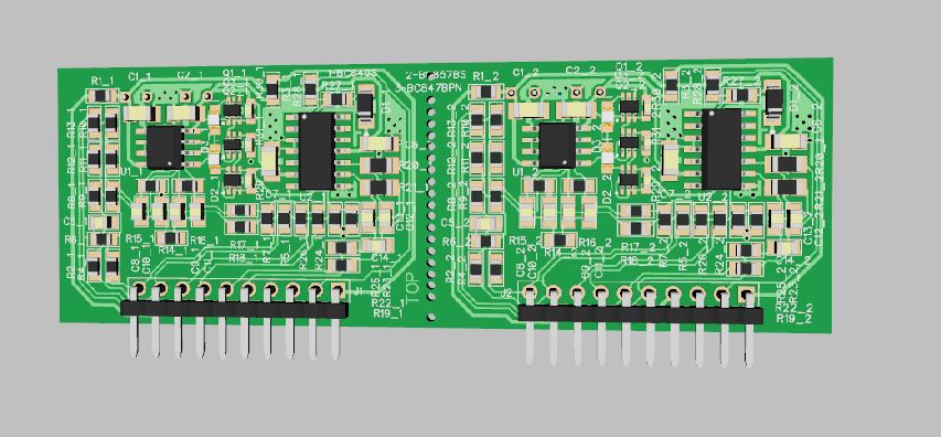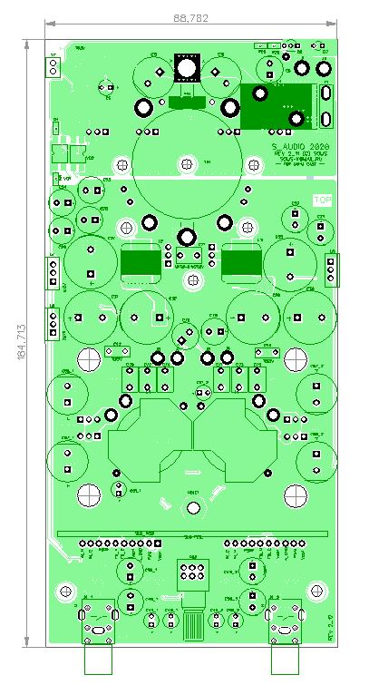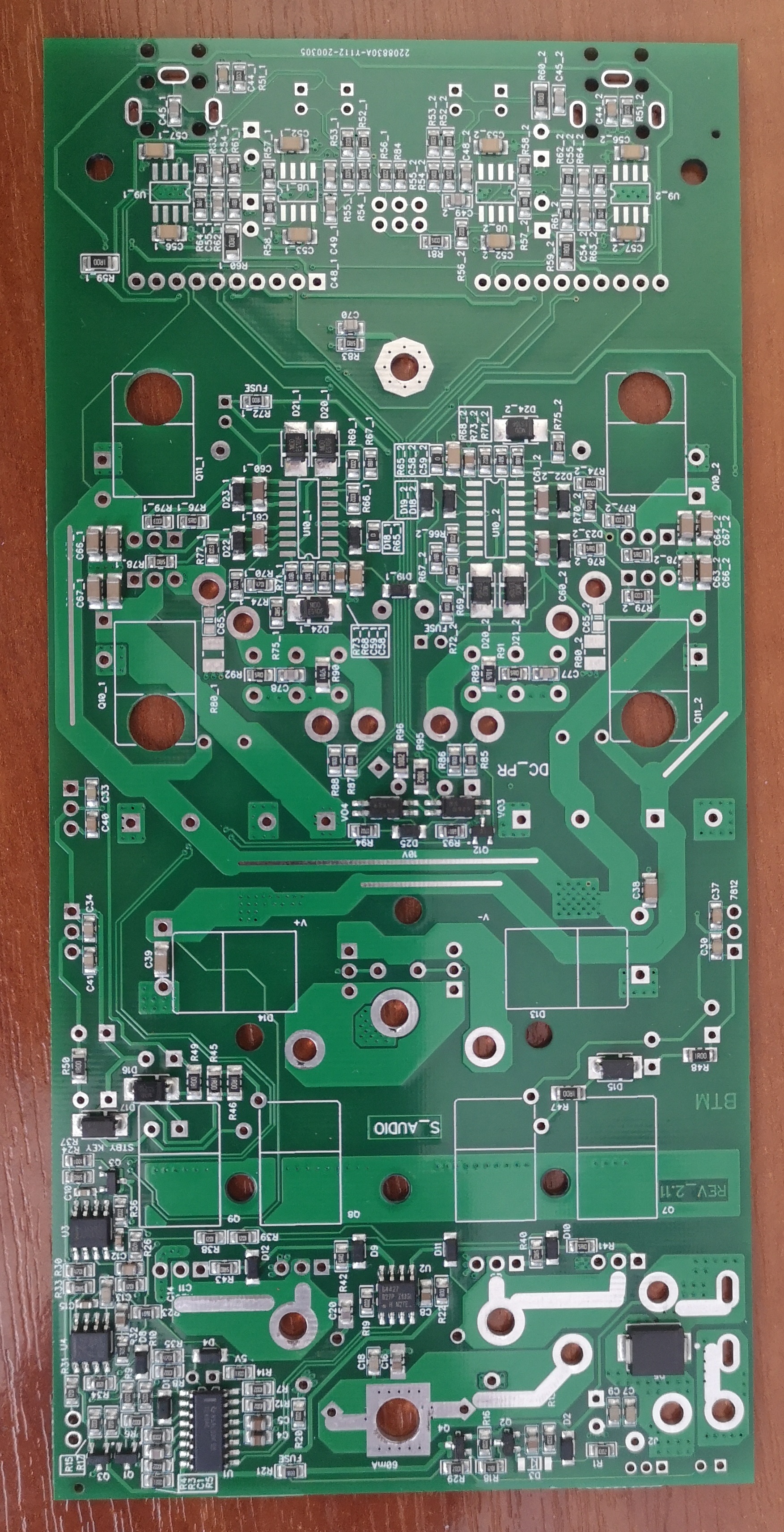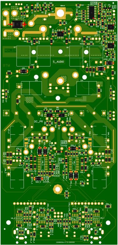 С переходом на среду DIPTRAСE и производство плат по процессу с допусками лучше 0,2/0,2 получилось скомпоновать усилитель без субмодуля управления питанием, и применить выходные транзисторы в корпусах ТО220-3. Кроме того, полноценно реализован модулятор, который полностью копирует схемотехнику NCORE 500OEM.