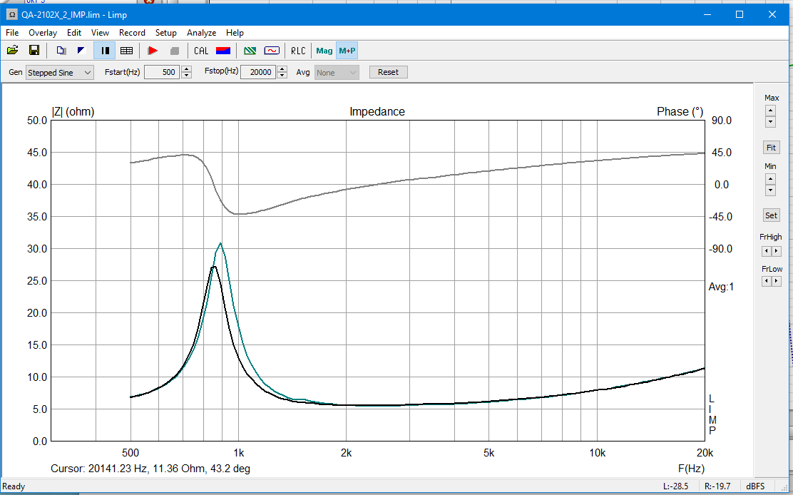 Ну собственно приехали пищалки эти, вот немного картинок и данных. Сделаны достаточно аккуратно, картинкам на сайте соответствуют, придраться не к чему. Активное примерно 6,4 Ом (мерял пинцетом НВ-14), индуктивность катушки 63 мкГн на 10 кГц. Наверное, многовато - на тех же 10 кГц мои TW29D показывают 6,5 мкГн. Резонанс оказался ниже заявленного (примерно 850 и 890 Гц против 1600 в бумажке-сопроводиловке). Вторая картинка - один из китайцев с оверлеем моего текущего Satori TW29D (шелк) 4 Ома, просто для сравнения хода кривулин.
