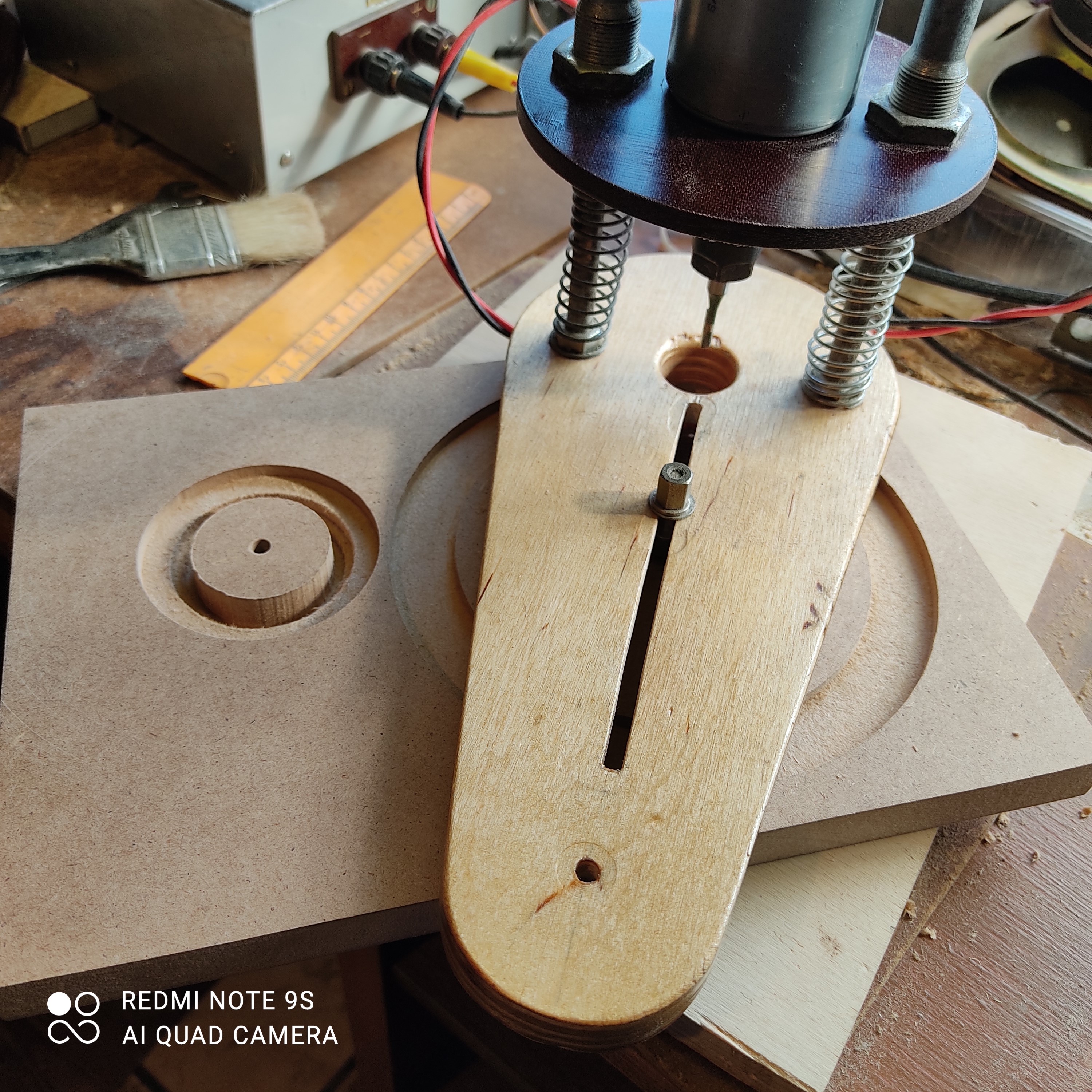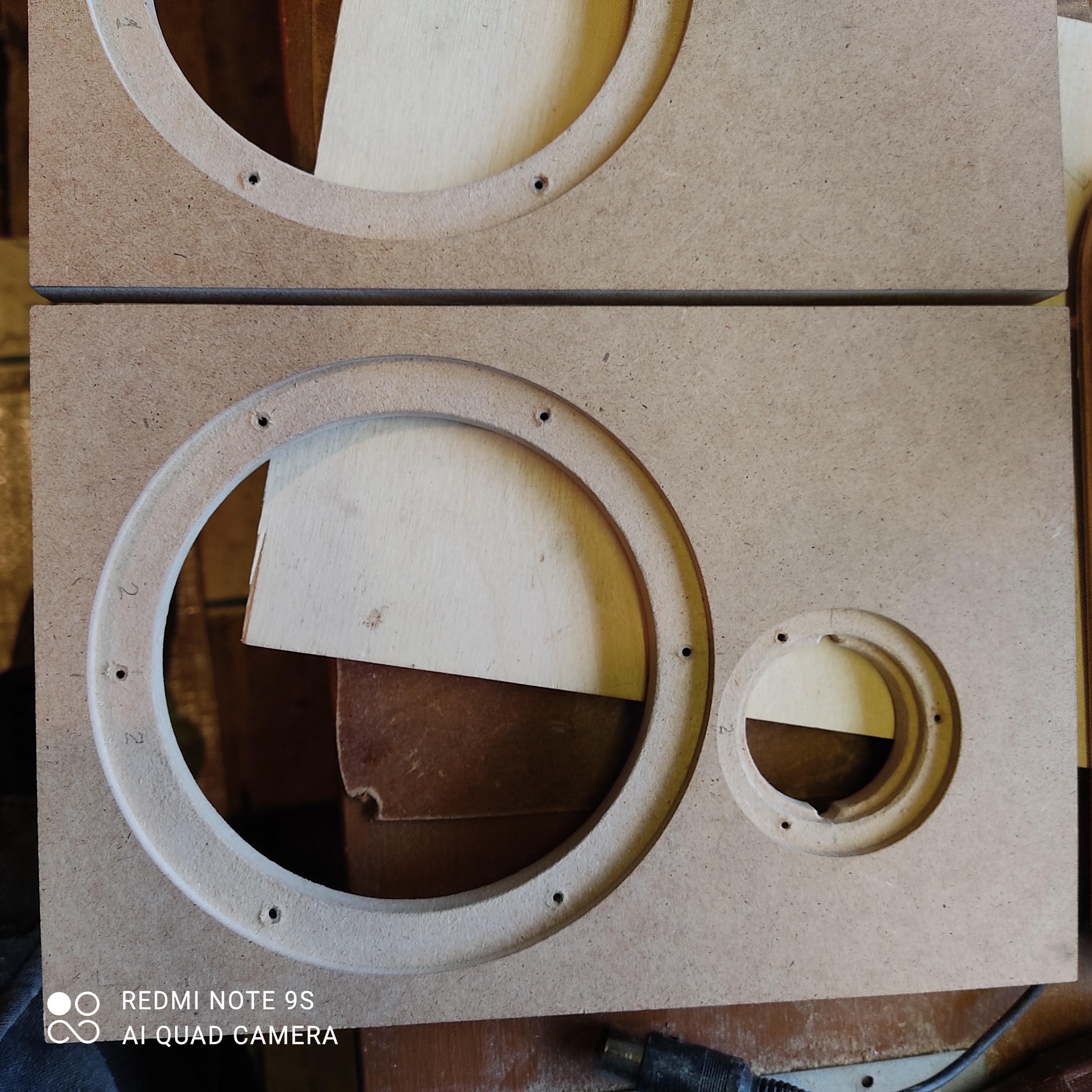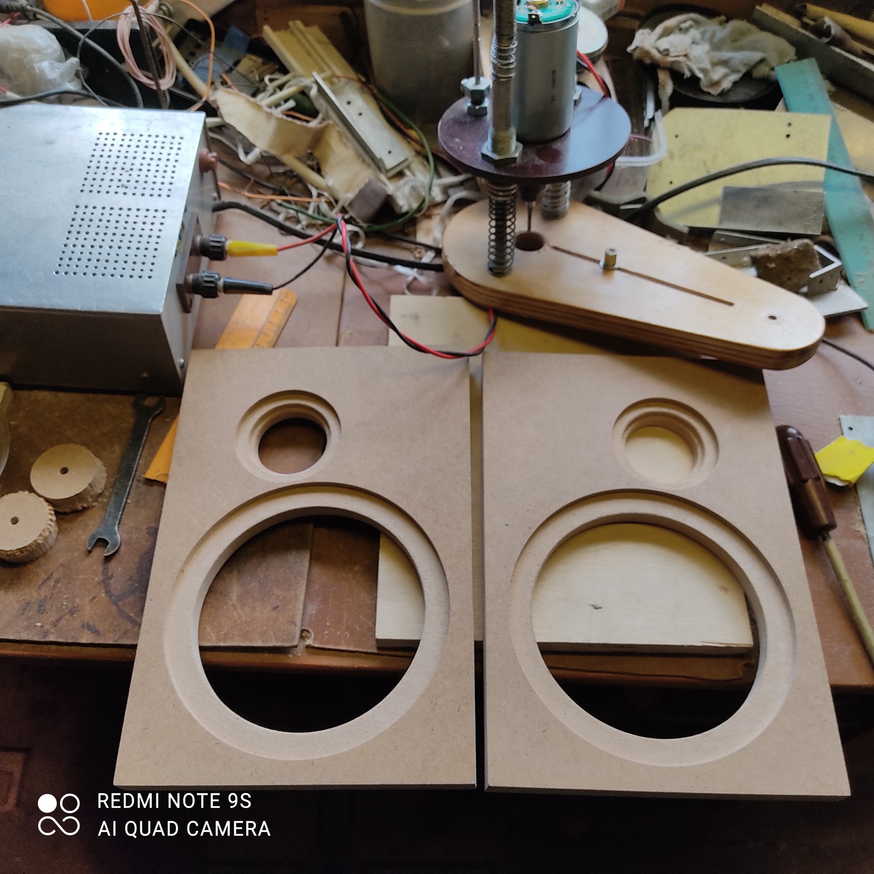 Для вырезания отверстий под динамики сделал такую приспособу.Нажмите на изображение для увеличения.