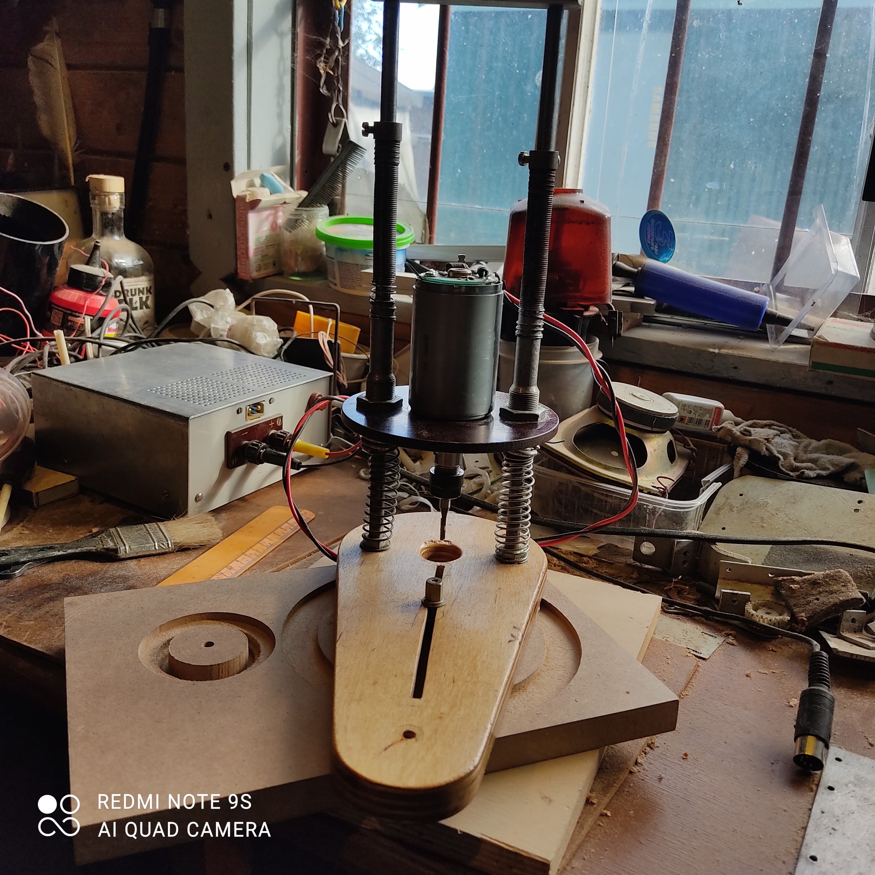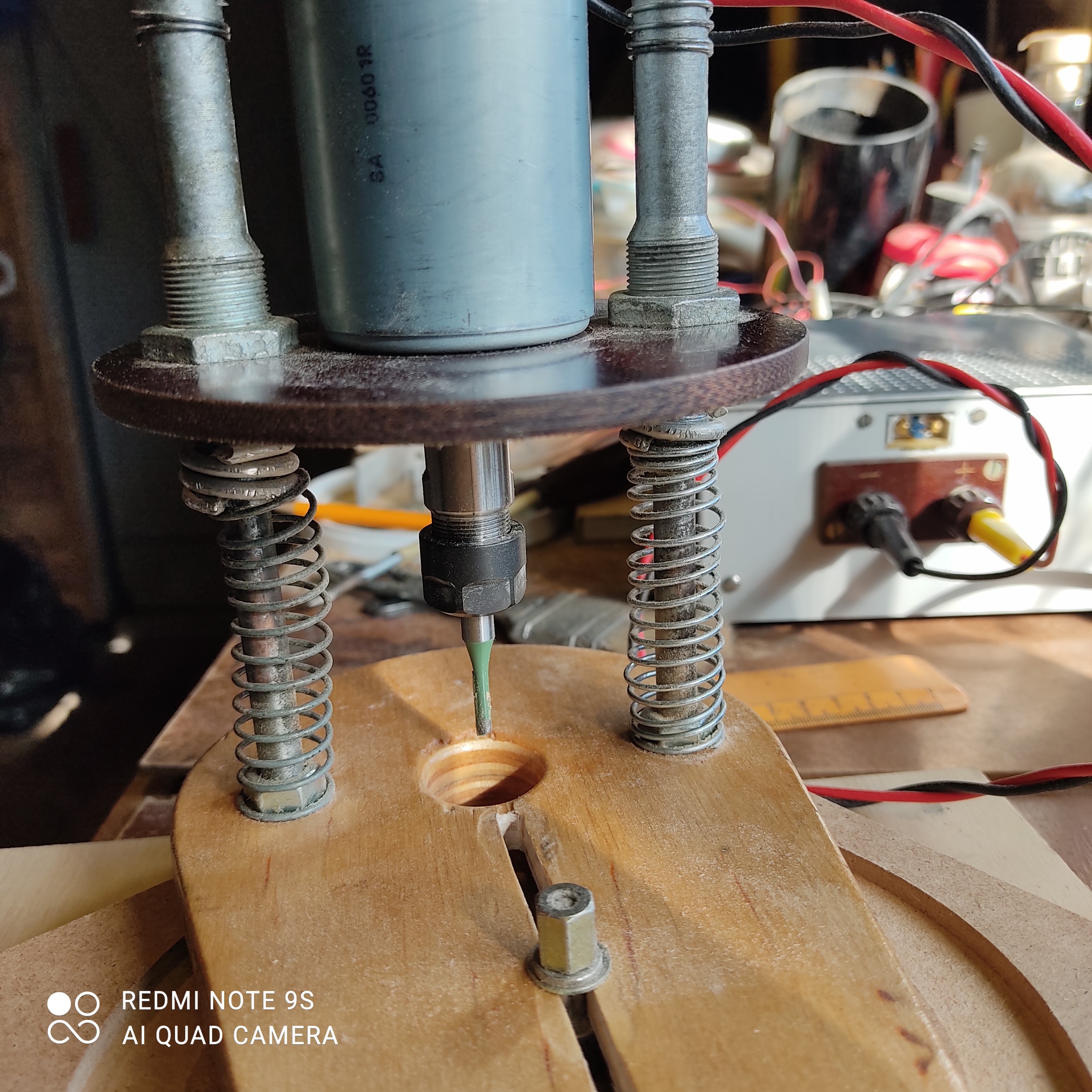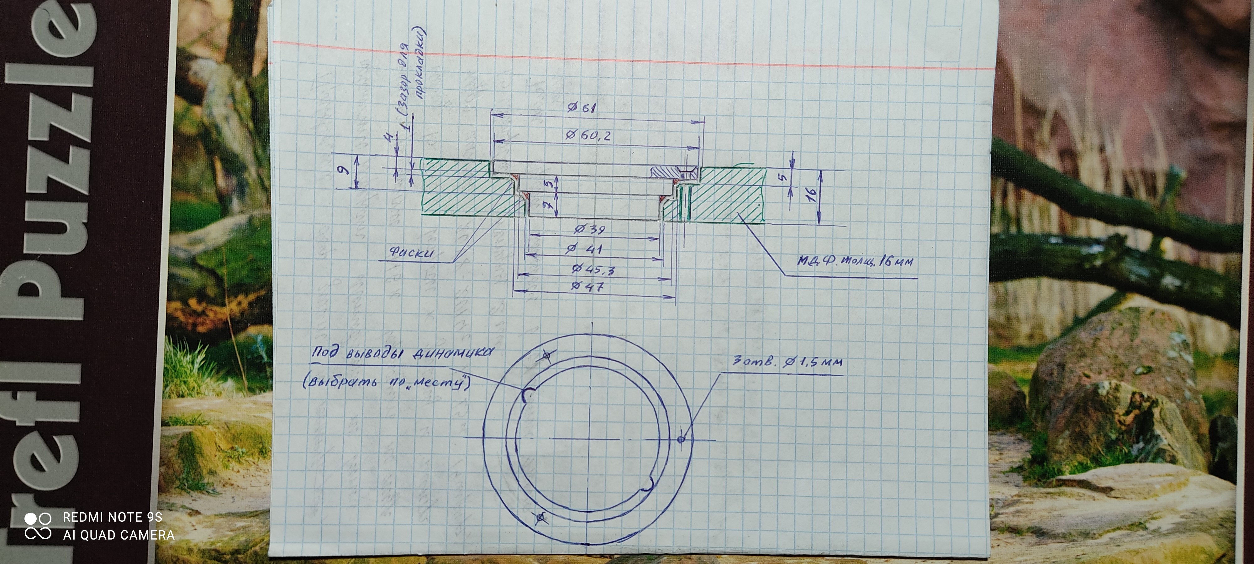 Для вырезания отверстий под динамики сделал такую приспособу.Нажмите на изображение для увеличения.