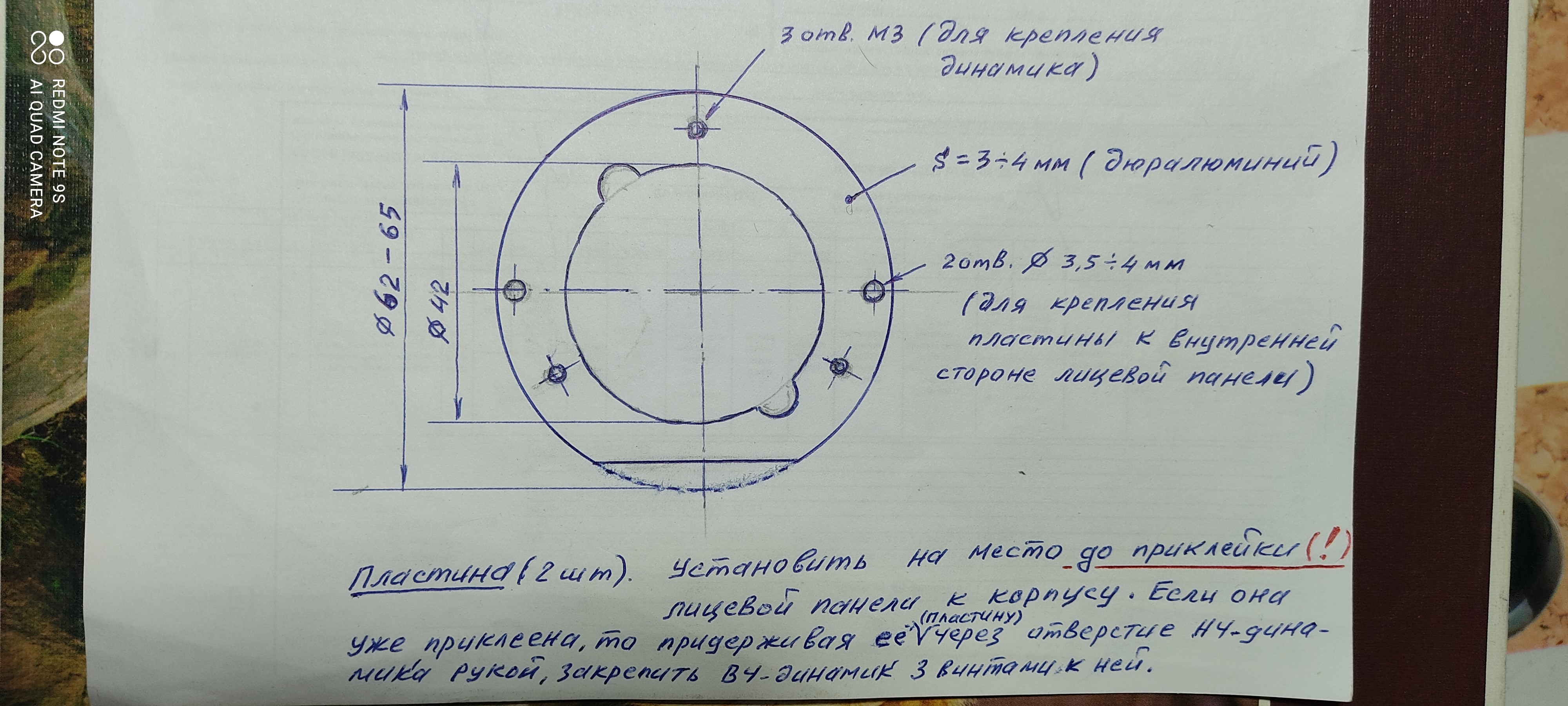 Чтобы не было проблем с установкой ВЧ динамика(не за что цепляться шурупам),предлагаю дополнить отверстие для него ещё одной ступенькой.Крепёжный компаунд на динамике не сошлифовывать(ослабляется крепление),а снять фаски в ступенях наждачкой.В нижнем отверстии сделать выборки круглым напильником,для выводов звуковой катушки.Крепить динамики шурупами,диаметром до 3 мм.Нажмите на изображение для увеличения.