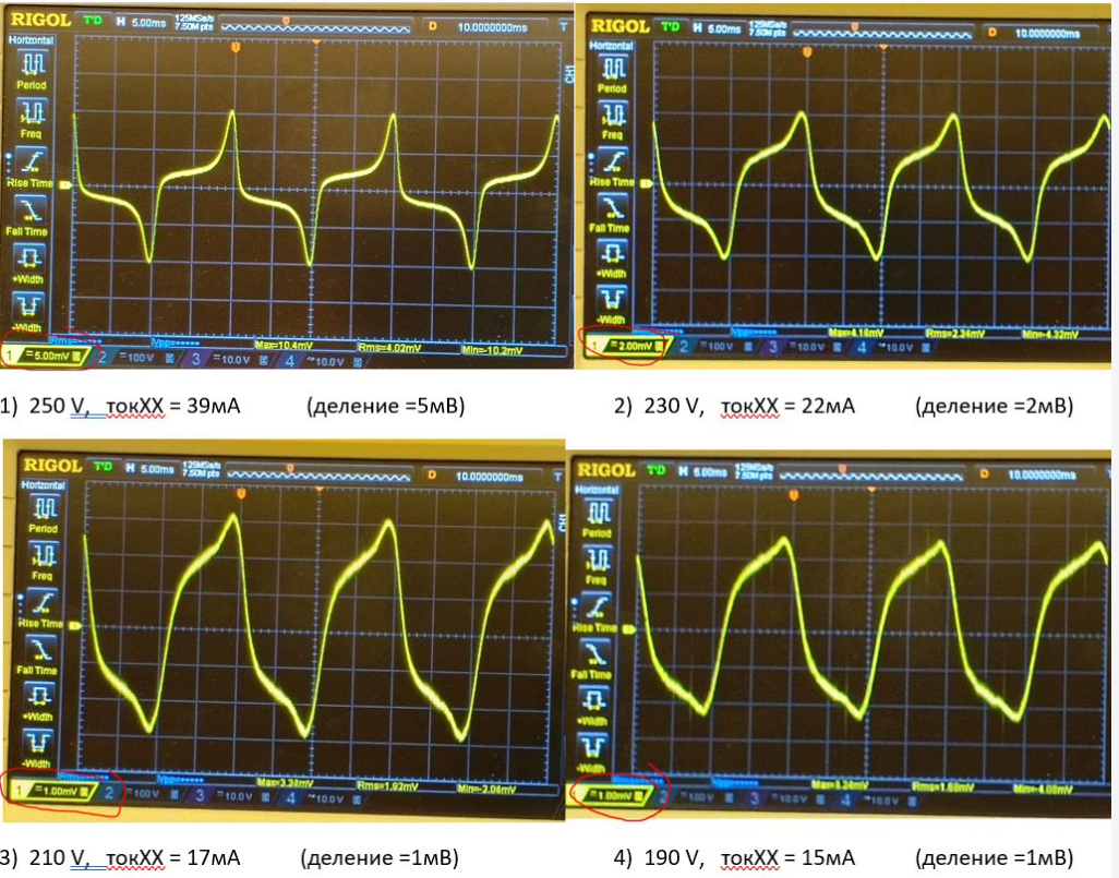 Подключил ТТП-1000 напрямую в сеть (было точно 230V), и получился сильно несимметричный график с током ХХ=60...80...100мА, который постоянно менялся:
