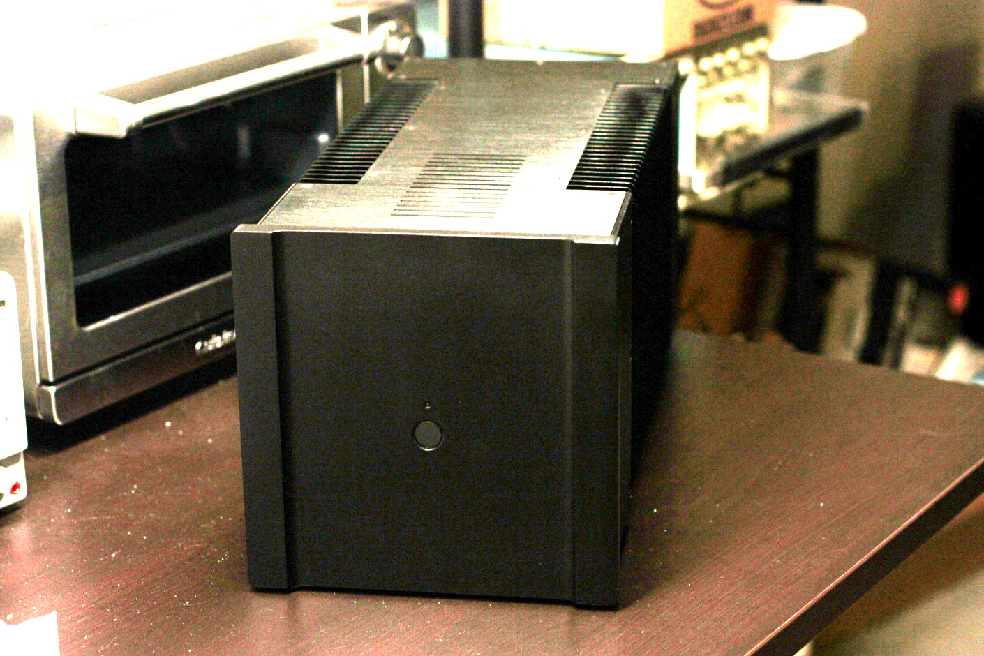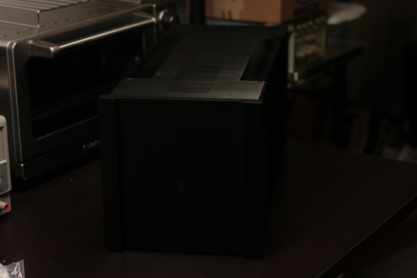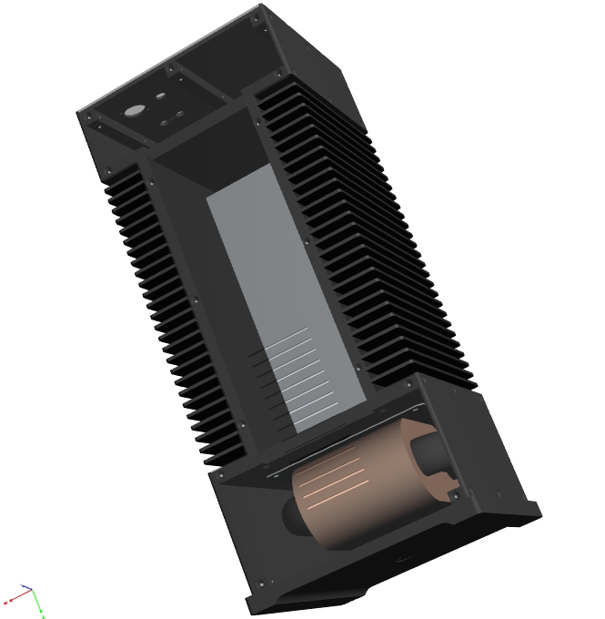 В переднем отделе плата и входной разъем, в противоположной стороне сетевой выключатель и транс (стоял так-же, только не R-core, а ТС-360 на ПЛ), радиаторы и "банки" - посередине. Что-то около 200 х 160 х 420 (ШВГ).