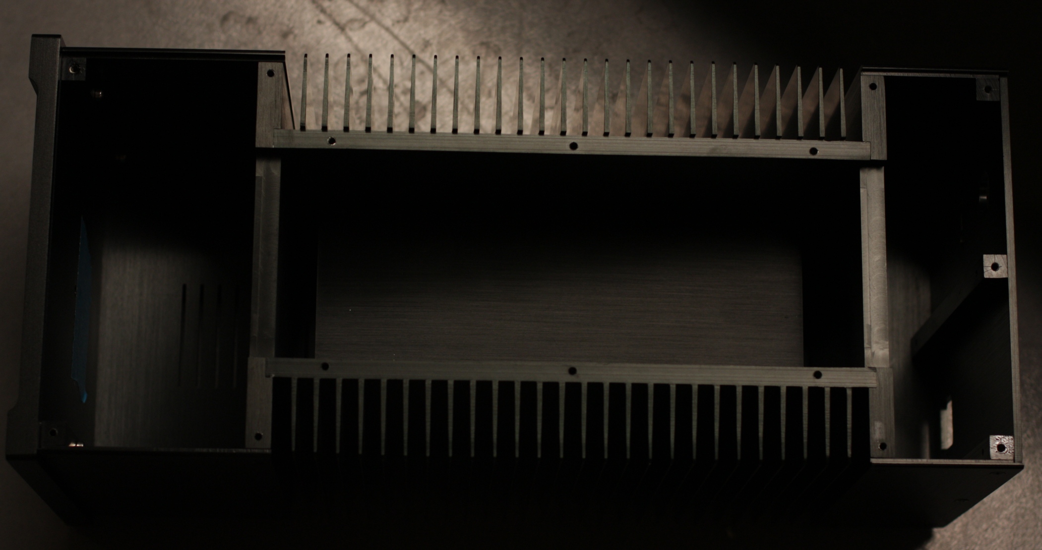 Дополнительно на лицевой и тыльной сторонах снизу были углубления-щели (положенный на бок П-профиль, он-же силовой элемент станины), которые играли роль импровизированых ручек для переноски. Иначе тягать очень уж неудобно (хотя уж всяко проще чем неподъемные ящики привычного формфактора на сопоставимые мощности - до 2х200).