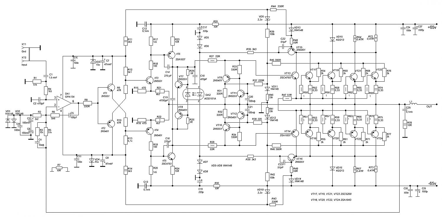 На просторах DIY audio совершенно случайно была обнаружена вот такая схема, довольно интересная. Оригинал статьи здесь: http://www.diyaudio.com/forums/solid...rcuit-amp.html . Привожу оригинал схемы и нарисованную в более читабельном виде. На основе усилителя А.Янкевича и Д.Роланда М-9 Vektor18 предложил новую реализацию схемотехники А.Янкевича с очень хорошим звучанием https://forum.vegalab.ru/showpost.ph...&postcount=127 Добавил фотографию ПП, схему и архив усилителя Vektor18 Собрано два канала усилителя Vektor18 звук получился очень прозрачный, детальный, с великолепными сценическими образами. Искажения на 1кГц составили 0,0034%, спасибо за измерения tsf54. Рекомендую! Добавил ПП на радиатор https://forum.vegalab.ru/showthread....l=1#post964065