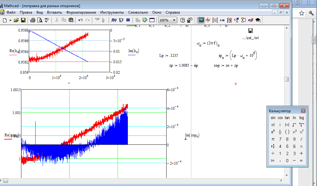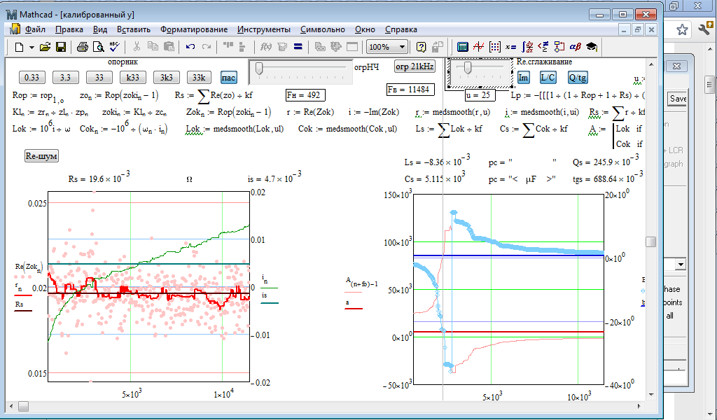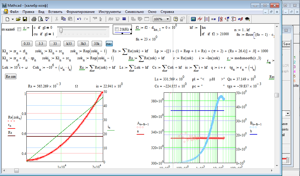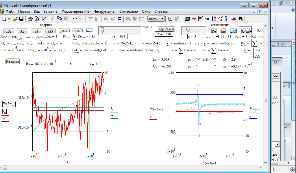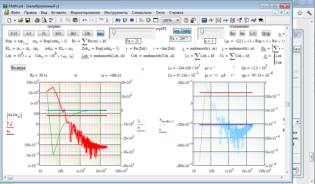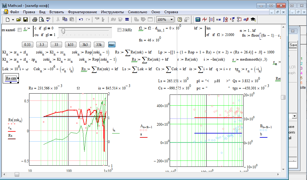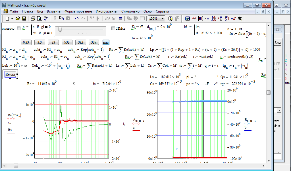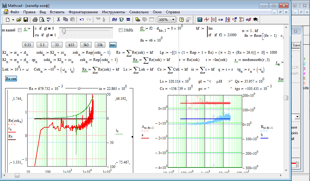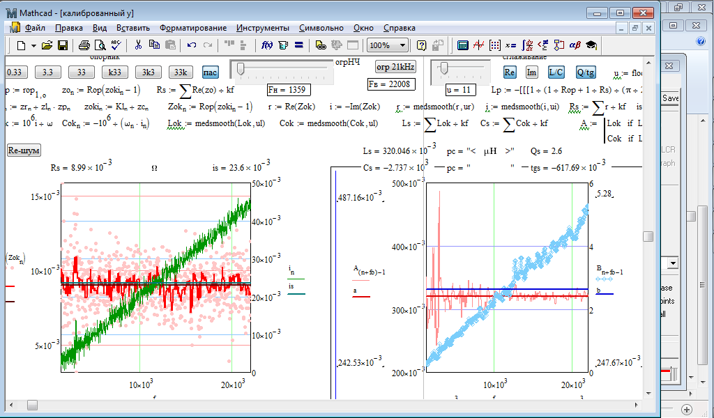 В последних версиях введена логарифмическая шкала сопроитвлений, компенсация паразитных емкостей и сопротивлений ЗК правда для правильной настройки желательно иметь параллельную схему замещения, которая реализована в Маткадовской приблуде Zok5.zip, для компенсации Свх (Сin) подключаем на вход резистор равный опорнику Zm при этом покажет его сопротивление и индуктивность, но это так действует емкость параллельная опорнику, поэтому в Маткаде включаем параллельную сх. зам-я и включаем "-Im", полученную емкость заносим в окно "Cin", делаем измерение на висячих щупах полученную емкость заносим в окно "Clr"